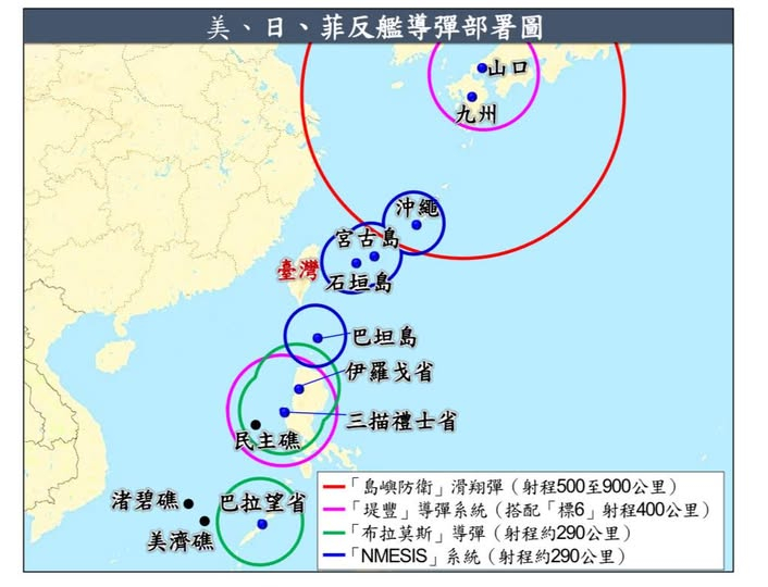 【图1】美国、日本和菲律宾在第一岛链部署的反舰导弹覆盖范围【图2】美军“暗鹰”远程高超音速导弹(射程3500公里)部署在第一岛链的打击范围