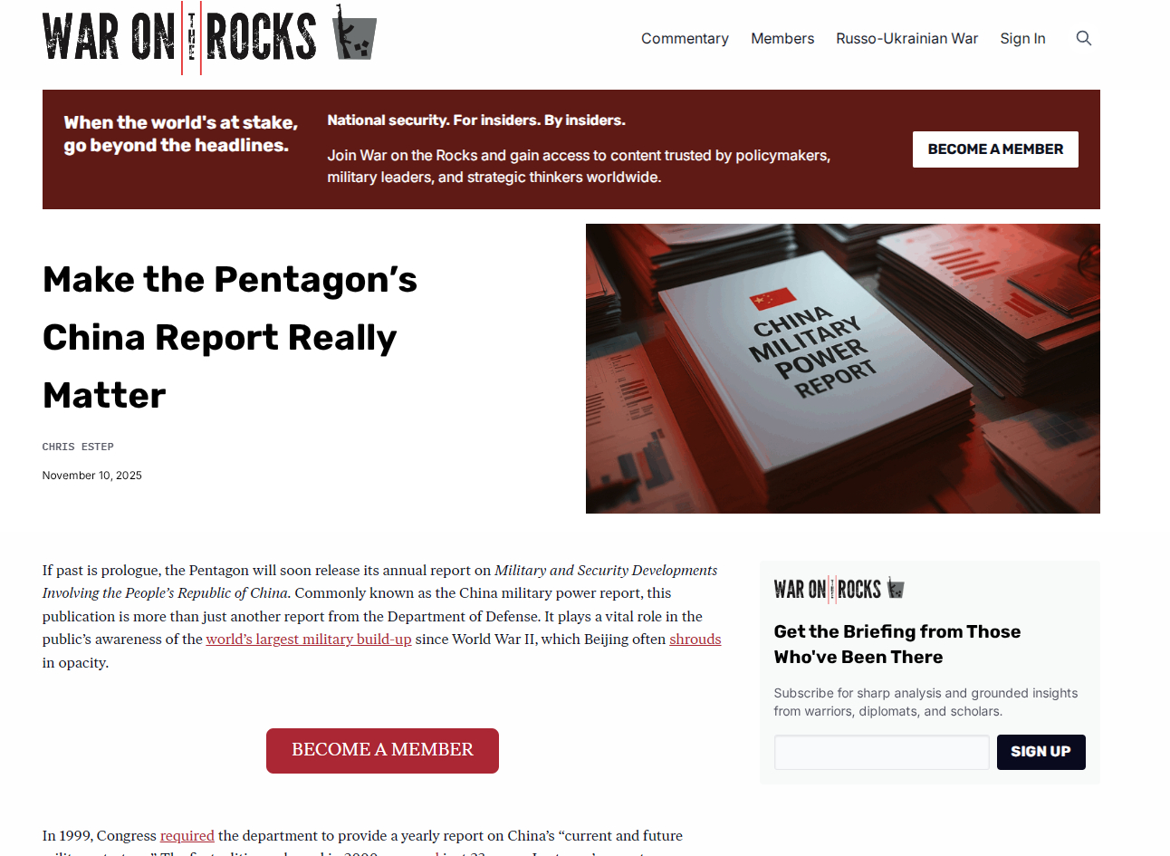 下班之前看看《中国军力报告》更没更。没更,但发现了一篇有意思的文章,war on rocks网站写的,题目是“发布中国军力报告真的很重要”。作者之前是众议院军事委员会新闻秘书,现在是个安全顾问。文章本身写的比较隐晦。但大概意思是,自1999年以来,中国军力报告非常重要,因为在对岸普遍保密的情况下,五角大楼的军力报告是美国国会和民众少数几个得知中国军力发展的情报来源,五角大楼不应该向公众隐瞒太平洋对岸发生了什么事情。文章最后这样说,在今年年底之前,国防部“可能”会以与过去25年基本相同的方式发布《中国军力报告》。为了确保该报告最适合2026年的现实,而不是2000年,国会应该彻底改革1999年制定该报告的法律,然后五角大楼应该跟进。所以为什么到了11月份,一个智库突然要求国会监督五角大楼出军力报告呢?言外之意可能很明确了。毕竟美国时间的今天已经是某种圣诞节假期。