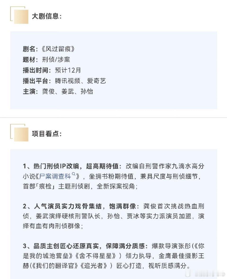龚俊、姜武、孙怡《风过留痕》播前招商,预计明年1月播出,热血警察终于来了