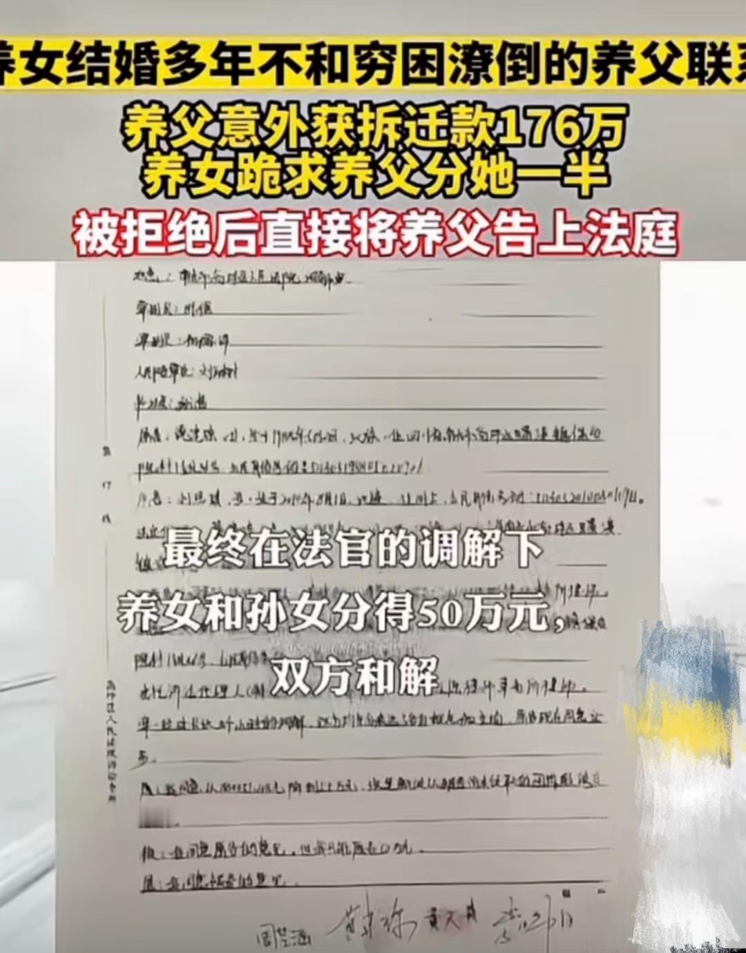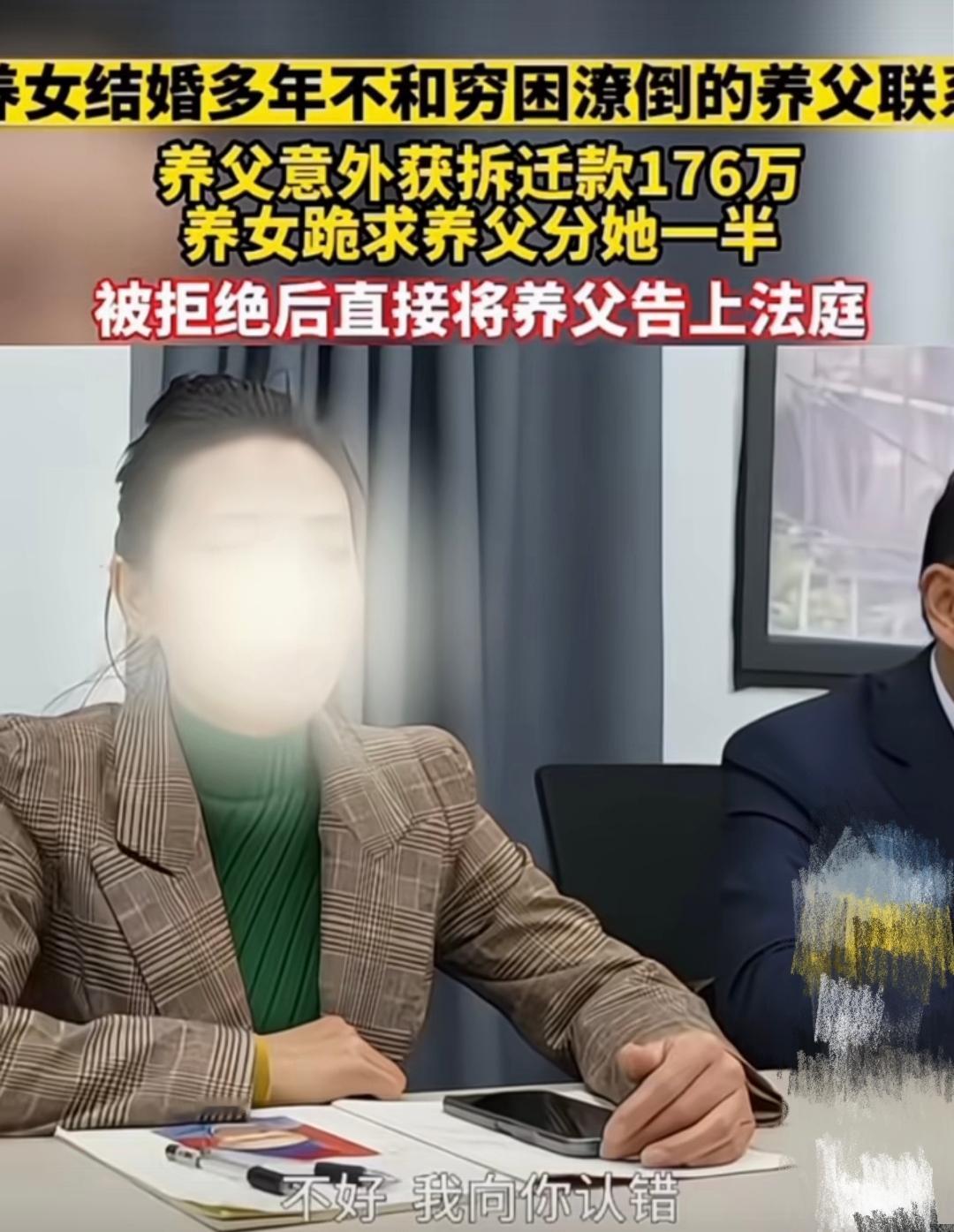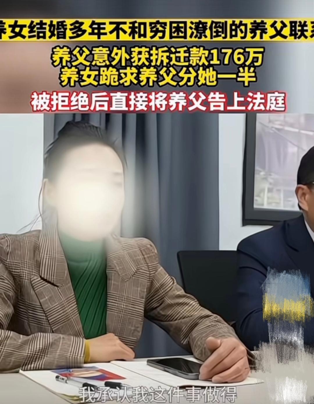 养恩大于天?现实给了善良老实人一记响亮的耳光! 一位老实巴交的农民,含辛茹苦将养女拉扯成人,省吃俭用供她读书。 长大后,养女顺理成章结婚生子,本以为能换来晚年一丝慰藉,谁知养女嫁了人后嫌养父家穷,直接狠心断了所有联系,就好像从来没有过这个父亲。 可命运似乎总爱弄人,养父意外获得176万元拆迁款。这消息传到养女耳朵里,消失多年的她竟火速找上门,恬不知耻的跪在养父面前,张口就要分走一半。 多年不联系回来就想分钱,养父心寒彻骨,当场拒绝了这种无理要求。可让他没想到的是,养女直接将养父告上了法院。 更让网友意难平的是,经过法院调解,双方最终达成和解,养女竟然成功分到了50万元! 这结果让人无法接受,凭什么?有什么资格来分拆迁款? 养女嫁人后就断联,不管养父死活,如今见钱眼开跑回来分钱,于情于理都说不通。 更何况养女根本没尽到半点赡养义务,法院为何还要调解分钱? 虽然法律规定,养子女与婚生子女享有同等继承权,但前提是存在合法的收养关系且未尽赡养义务者应当不分或少分 。可这场调解的结果,难道不是在纵容“忘恩负义”? 一笔拆迁款,拆出了人性最丑陋的一面,也寒了天下养父母的心。而这个调解结果,更让很多人困惑:法律的公平正义,难道不该为“知恩图报”撑腰,为“忘恩负义”亮剑吗? 最后,想问问各位,养女有资格分这笔钱吗?