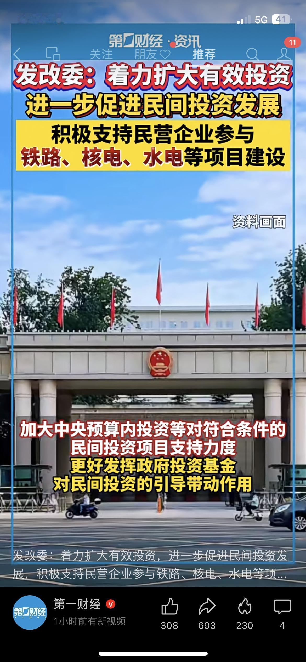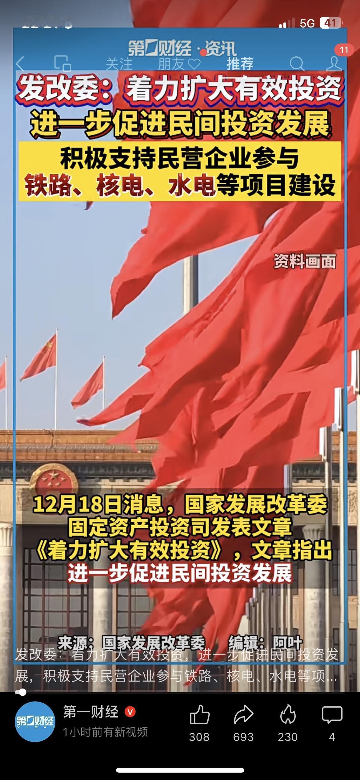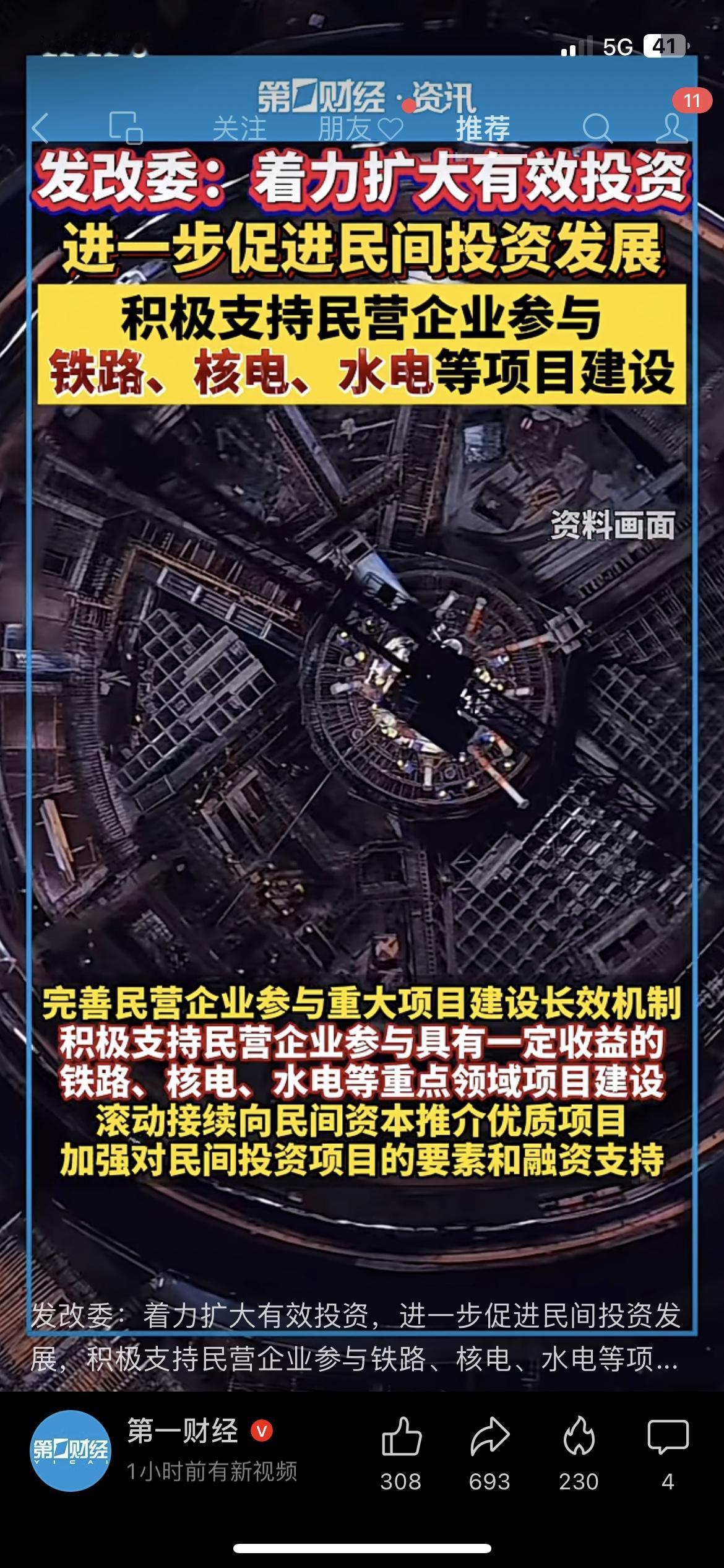 🔥重磅!民企可参与铁路核电水电项目建设了 做工程的王老板看到政策,立马召集团队开会:终于能入局重特大基建项目了。 12月18日发改委发文,明确支持民营企业参与铁路、核电、水电等重点项目建设。 官方还将加大资金支持、完善长效机制,向民间资本推介优质项目。 民企入局基建赛道,市场活力和投资机会都将迎来新突破。 你看好民企参与重特大基建项目的发展前景吗?