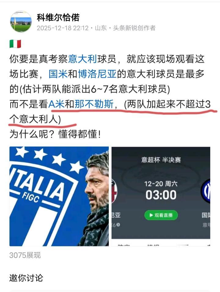 🇮🇹 我本以为这场比赛那不勒斯会上2个本土 ,A米会上一个本土,两队加起来最