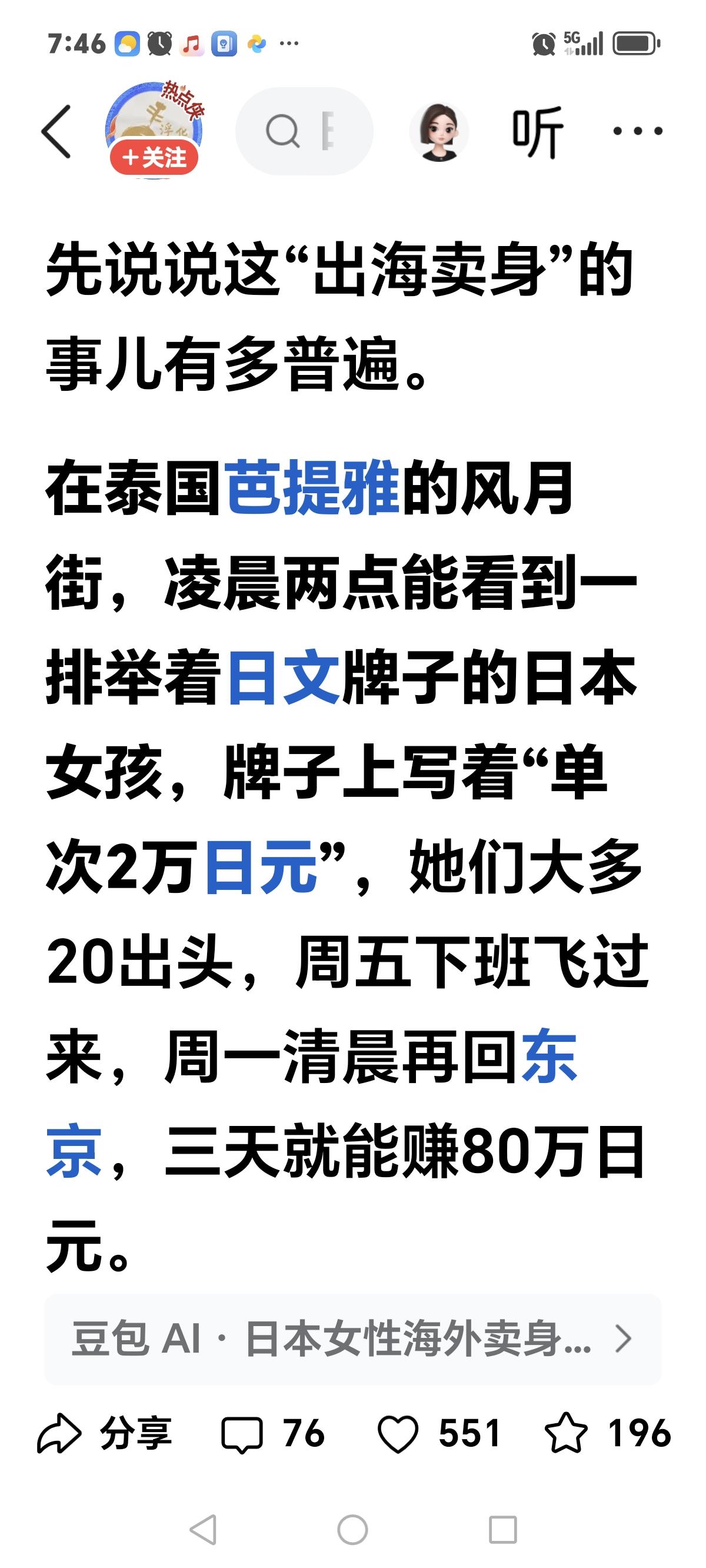 震碎了三观,这么多的日本年轻的女性为了还夜店牛郎债,甘心情愿组团出国卖春,三天时间接单40次赚80万日元… 日本的年轻人流行三不 不结婚不生娃不买房子 这些日本女性 喜欢去夜店找牛郎 在他们身上花光了钱 还欠了很多的高利贷。 为了还这些债 很多日本年轻女性去东南亚一些国家卖春,星期五到星期六,在这里是2万日元一次,三天时间大约赚80万日元,星期一早上又回到了公司上班。 这也太离谱了吧? 日本不是很有钱 怎么堕落成这样了?