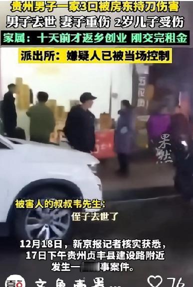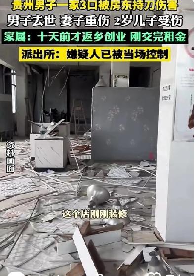 本是回乡创业刚交完房租一家三口就被房东持刀伤害!男子去世,妻子重伤2岁儿子也受伤了!起因究竟为何? 一个怀揣希望的返乡创业梦,在十天内骤然破碎。在贵州省某市,一个年轻的三口之家刚刚踏上返乡创业之路,却在缴纳租金后不久,遭遇房东持刀袭击。这起恶性案件导致丈夫不幸身亡,妻子重伤,年仅两岁的儿子也未能幸免。当地派出所证实,嫌疑人已被当场控制,案件正在进一步调查中。 据被害人韦先生的叔叔透露,韦先生12月8日才结束在义乌的打拼回到贵州,怀揣着创业热情租下门面房,签下了三年租房合同后并足额缴纳租金,满心期待能在家乡扎根立足。然而,就在2025年12月17日下午,刚从浙江义乌返回家家乡贵州的韦先生,带着妻子和未满2岁的儿子前往正在装修的店铺查看进度时,遭到房东持刀袭击。悲剧最终造成韦先生当场身亡,妻子重伤,年幼的儿子也未能幸免受伤,一家三口的人生轨迹被突如其来的暴力彻底改写。 让人难以理解的是,为何刚刚完成租赁交易,就发生如此极端暴力?双方又有什么解不开的矛盾呢?难道是房东有精神问题?愿逝者安息,伤者早日康复。期待相关部门能尽快查清事情真相,给受害者一个交代。不管与人相处有什么矛盾纠纷,我们都应该敬爱生命,不应以剥夺他人生命为解决方式!