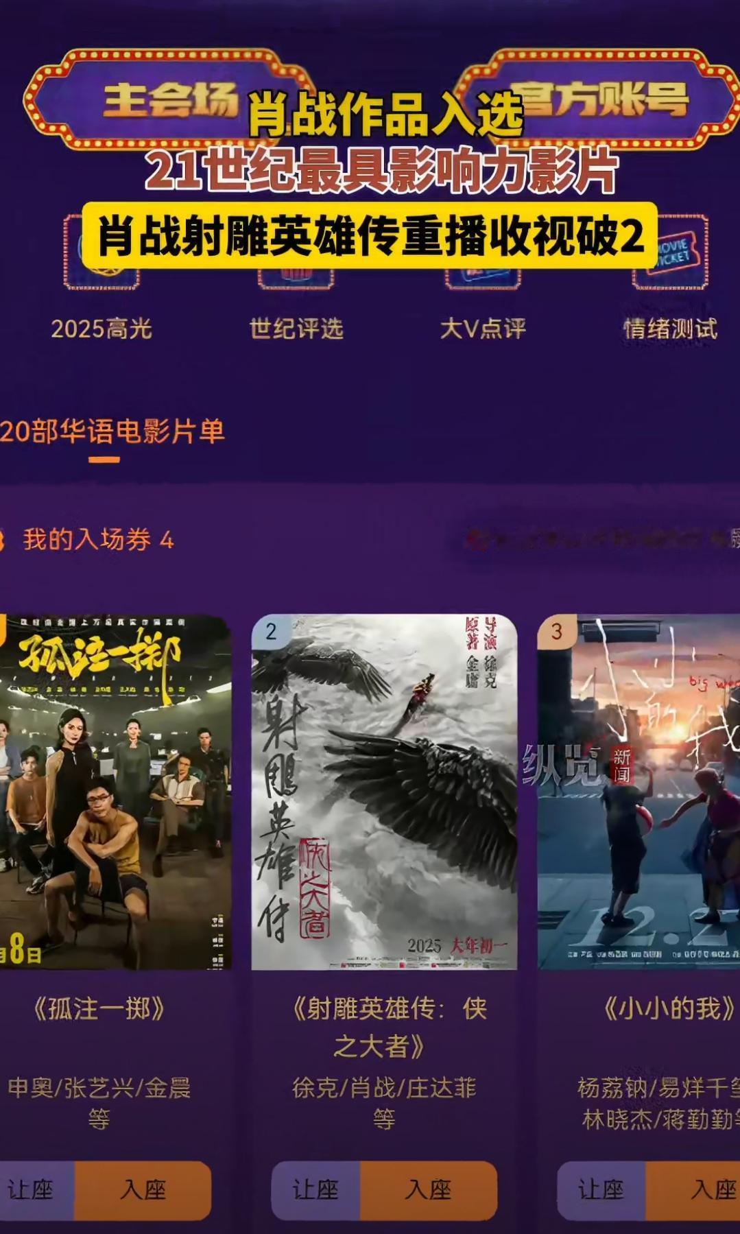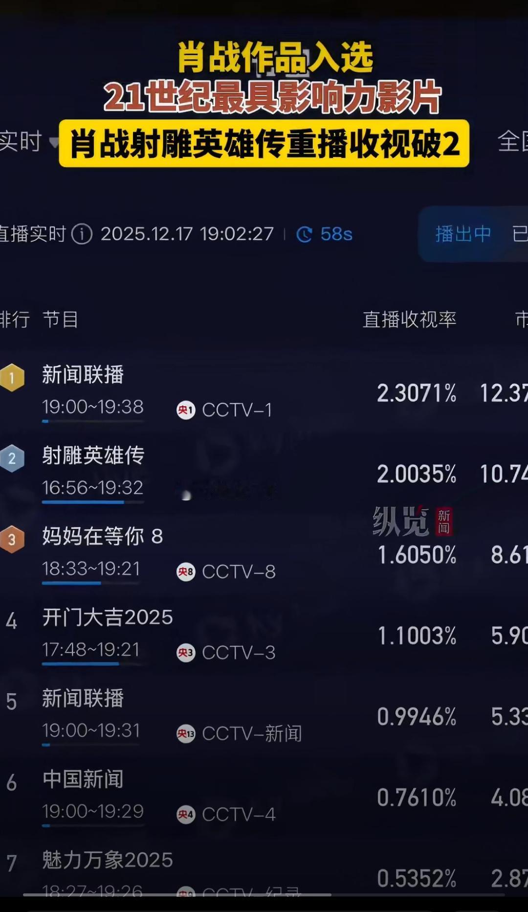 肖战《射雕》杀疯了!收视口碑双爆太能打 家人们谁懂啊!肖战主演的《射雕英雄传:侠之大者》又又又火出圈了! 不仅入选21世纪最具影响力华语电影名单,还在CCTV6重播拿下破2的实时收视率,这数据简直逆天! 当初预售就刷新春节档纪录,如今口碑收视双丰收,妥妥的实力派认证! 属于肖战的武侠江湖,还在续写高光时刻!