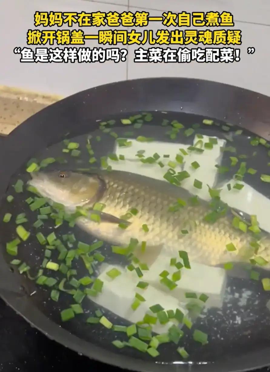 南京小陈第一次给闺女烧红烧鱼,直接把活鲫鱼扔进沸水,撒葱花时鱼突然张嘴把葱卷进去