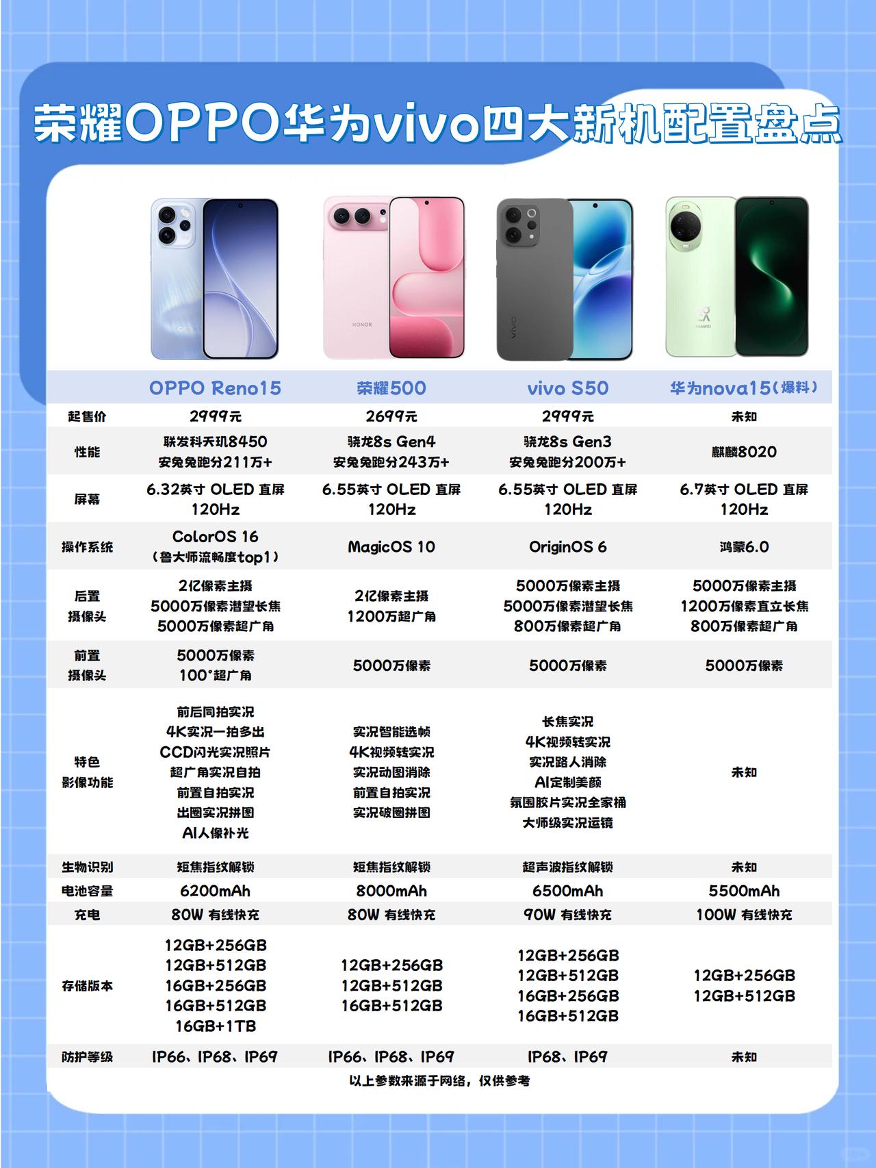 ❓荣耀0PPO华为vivo四大新机,选哪个好 2025年都快过完了,估计有很多宝子打算趁年底换新机 可能会有很多人想了很久,如果预算就3k 我觉得这四台热门新机就比较符合需求👇 📱荣耀500 这台属于特点鲜明的机型,外观好看,还有骁龙8s Gen4,性能不错,电池更是上了8000mAh,续航持久;就是拍照没有长焦,适合续航重度手机用户。 📷OPPO Reno15 Reno15是精致小直屏,背面的裸眼3D蝴蝶结纹理很吸睛,颜值质感都挺好的; 搭载ColorOS 16,系统流畅,各种AI功能也很实用高效。 关键是拍照这块很能打,2亿主摄,还有5000万像素潜望长焦,live玩法也很丰富, 尤其是出圈实况拼图,自由组合2-9张实况照片,做成动态3D效果,好玩又好看,很适合喜欢拍live的朋友。 性能主流游戏基本不卡,天玑8450安兔兔性能跑分比骁龙8s Gen3都要高。 🌸华为nova15 外观大改,用上了橫置大矩阵镜头设计,看着很高级,辨识度高。系统会搭载鸿蒙6.0,屏幕是6.7英寸大直屏,自拍这一块应该会继承前代的特色,适合花粉和自拍爱好者。 💃vivo S50 这台手机在人像拍摄上玩法丰富,主打长焦Live拍照,将大师级运镜、长焦 Live 和氛围滤镜集于一身,适合喜欢拍人像的朋友。 💡个人觉得这四款手机真的各有各的好 不说完美,但各有特色 华为nova15有鸿蒙系统 比如荣耀500有很大的电池 我个人是超爱拍live,比较倾向于OPPO Reno15🤔 系统是安卓里面zui流畅的 实况玩法会比S50、500这些更丰富一点 你们觉得哪台更值得冲?👇 国产手机华为vivo荣耀OPPO Reno15
