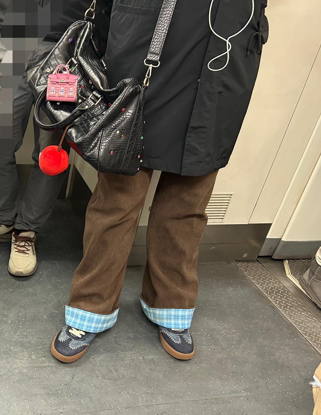 在地铁里,我先看到他的脚,然后裤子,吸引我的是这个佩戴了很多饰物的包包,再我拿上看,然后偷偷拍了照片。 你们以为是女生?错,是个男生。[大笑][捂脸]