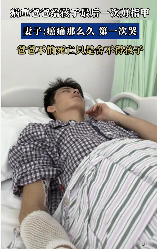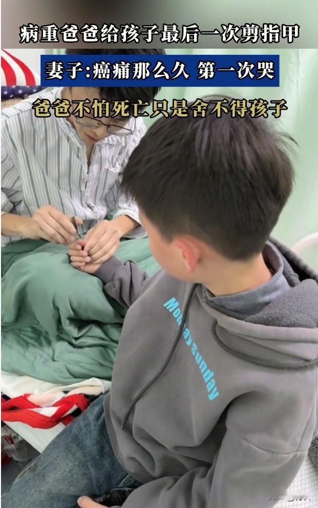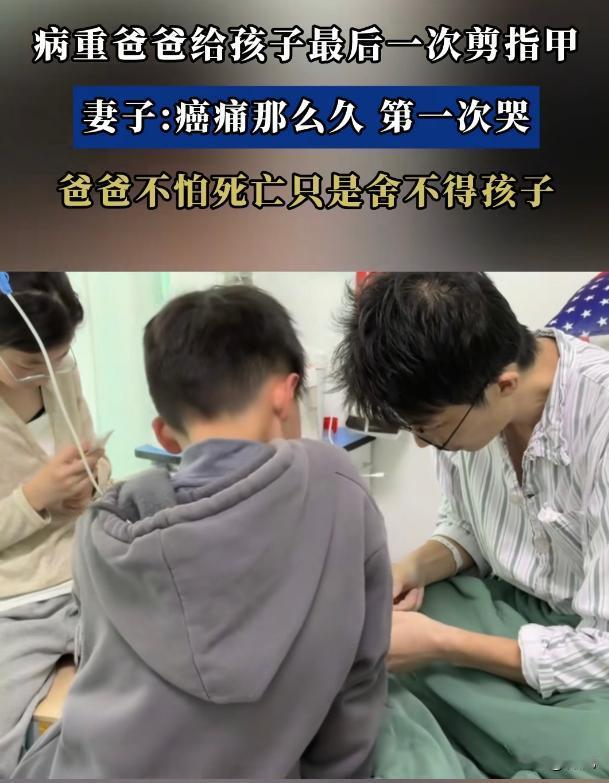 一位38岁的癌症晚期父亲,在自己整个与癌症抗衡的时间里,没有掉过一滴泪。 但是,却在给儿子剪最后一次手指甲的时候哭了。 38岁,还是一个男人正有魅力,正意气风发的时候。 膝下有子,家里还有父母,老婆。 这是男人这一辈中最艰苦的时刻,也是最幸福的时刻。 只可惜,这位老兄,只能哭着告别自己的孩子。 他是一个坚强的男人,自己再疼,在难受,他都没有掉一滴泪。 但是,在幼小的儿子和女儿,进入病房的一刹那。 他,再也控制不住自己的感情。 这份感情是对自己的孩子的牵挂,放不下的感情。 这是对孩子未来成长的担忧,和不能陪伴的愧疚之情。 他的事情,之所以会上头条榜。 主要是戳中了无数同龄的中年男人的软肋。 这是一群怎样的人呢? 这是一群85后。 出生的时候赶上计划生育。 上学的时候赶上大学扩招,文凭贬值。 买房的时候,赶上房价飞涨。 结婚的时候,干上彩礼攀比。 好不容易在大城市混的差不多,一回头,发现这些年挣得钱,都被腰斩的房价吸走了。 这个时候,任何一个小小的困难,都会压垮男人的肩膀。 这时候,只能祈祷! 祈祷自己能够健健康康的打工。 祈祷自己能够长长久久的做牛马。 小时候的什么梦想,少年时候的什么轻狂,青年时候的什么志向。 统统被现实打败。 兄弟们!坚持住!