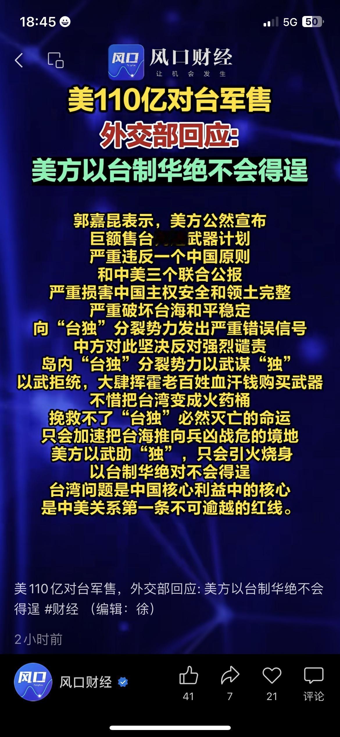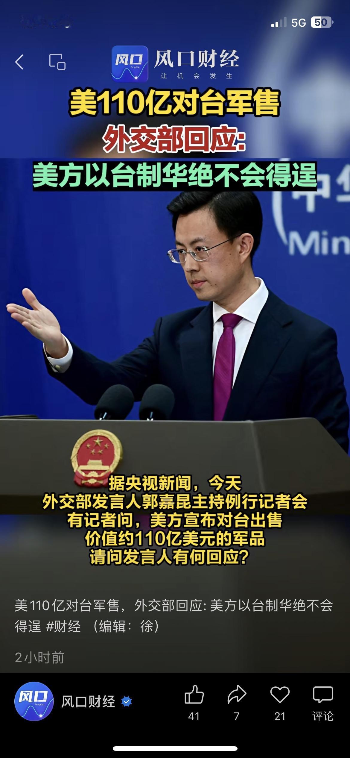🇨🇳外交部硬刚!美110亿对台军售 以台制华绝不可能 刚刷到外交部发布会消息,关注台海局势的老张瞬间攥紧了拳头:美方又在搞对台军售的小动作。 美方宣布对台出售价值110亿美元的军火,郭嘉昆发言人当场强硬回应,直指此举违反一个中国原则。 这波操作分明是给“台独”势力递刀,妄图破坏台海和平稳定,简直是打错了算盘。 台湾问题是中国核心利益中的核心,红线绝不容触碰,以台制华的图谋注定彻底破产。 你怎么看美方这次对台军售的行为?