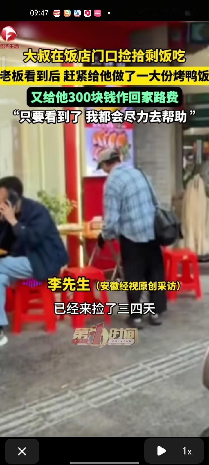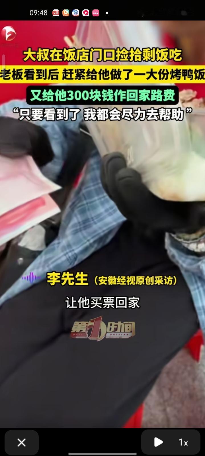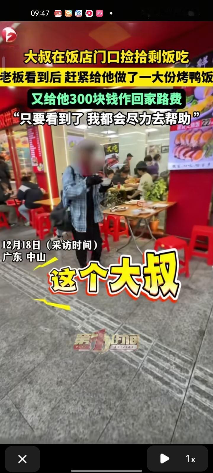 12月13日,广东中山。网友发视频称,一位大叔在店门口捡别人的剩饭吃,听服务员说他已经捡了三四天了。猜到大叔可能遇到困难,就给他做份烤鸭饭,听闻大叔说没钱回家,就给他300元作回家路费。只要谁遇到困难了,都会尽力去帮助,目前已经帮了好几个这样送回家的了。
