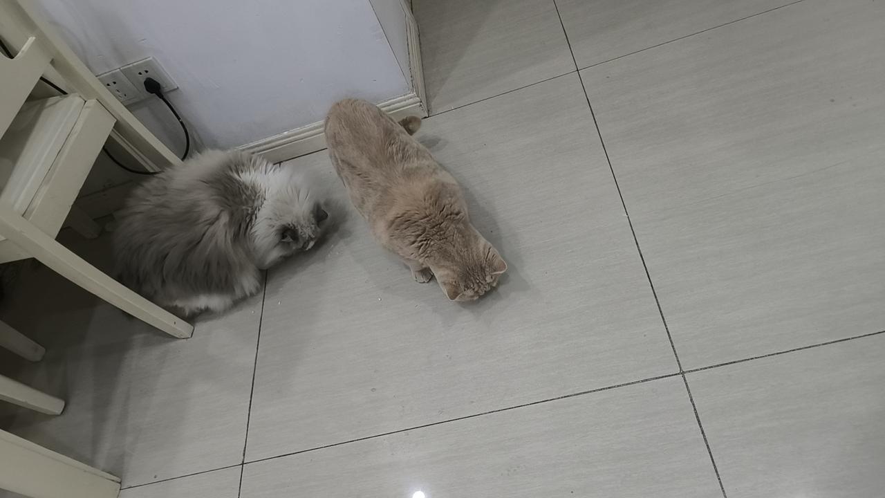 两个“小可爱”在觅食,猫零食是他们的最爱,不忍打扰[可爱]