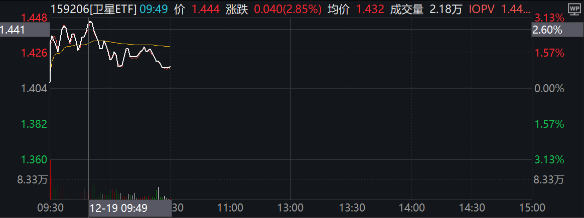 12月19日,商业航天概念再度爆发,卫星ETF(159206)盘中一度涨近3%,截至10:26,上涨1.14%,成分股信科移动(688387)领涨,航天智装(300455)、中国卫星(600118)、隆盛科技(300680)等个股跟涨。
