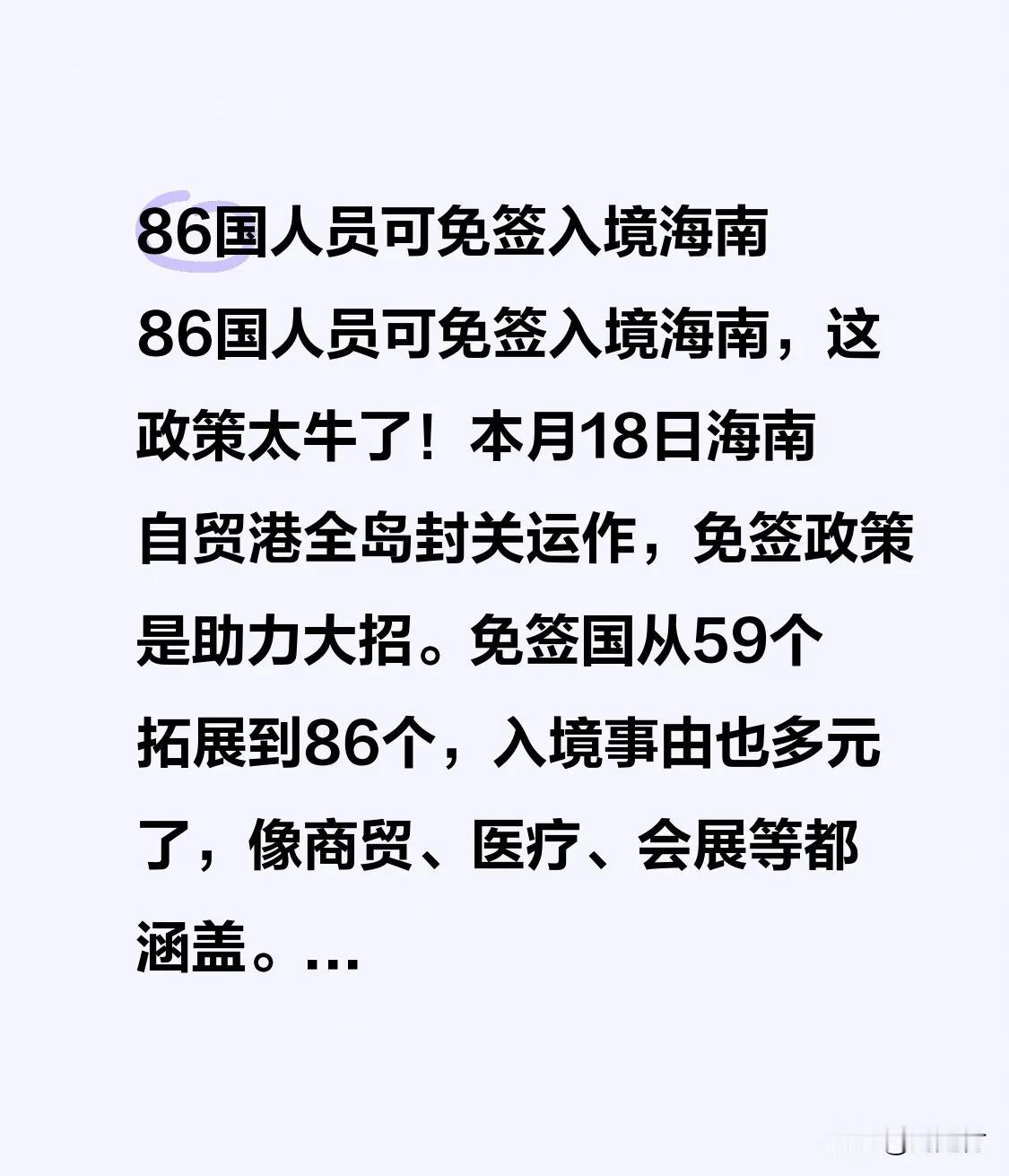 86国人员可免签入境海南 86国人员可免签入境海南 本月18日,海南自贸港全岛封关运作,86国人员可免签入境海南,这一政策堪称助力大招。免签国从59个拓展到86个,入境事由也更加多元,涵盖商贸、医疗、会展等领域。 12月11日,澳大利亚游客阿曼达从落地到通关仅用15分钟,兴奋不已。美国游客也认为海南对企业友好,气候宜人。 封关后,约74%商品进口零关税,税目从1900多个增至6600多个。这一系列政策让海南旅游和商业发展潜力无限,未来必将更加繁荣!