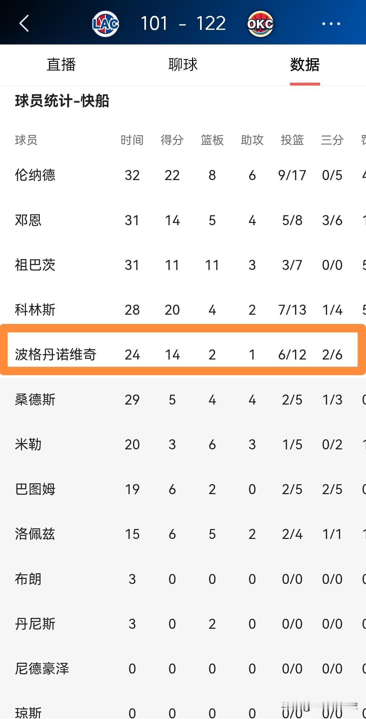 快船神射手博格丹诺维奇终于发威了!虽然今天快船在客场以101:122惨败于雷霆,但是博格丹诺维奇却打出了非常出色的表现。 全场比赛下来,博格丹诺维奇首发出战24分钟,投篮12中6,其中三分球6中2得到14分2篮板,他的场上正负值为+1。 坦白说,如果博格丹诺维奇能够在接下来的比赛中保持这样的出色表现,那么快船何愁不能实现反弹?