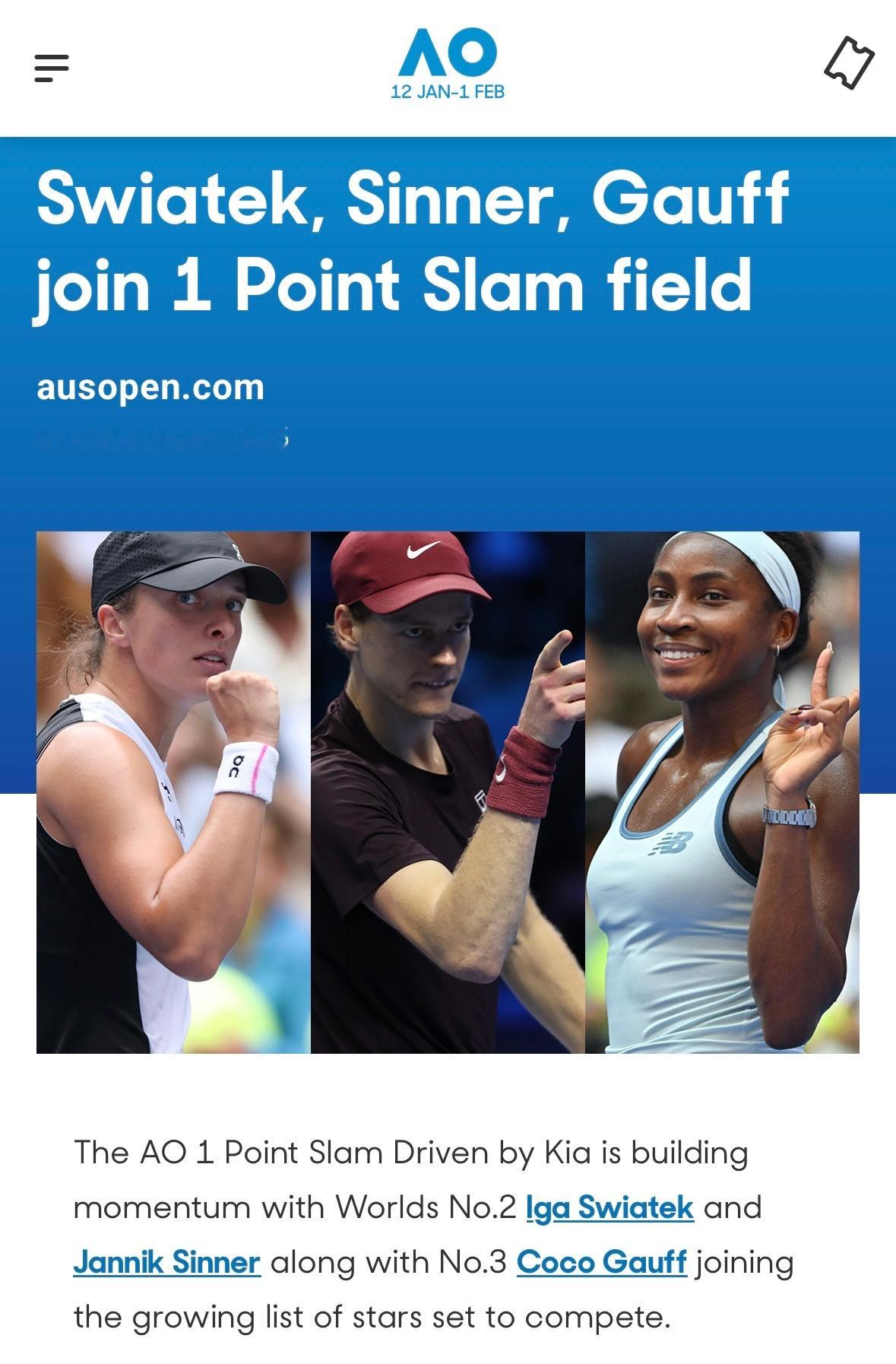 WOW!澳洲网协组织的“一分制胜大满贯”越搞越大,继阿尔卡拉斯和克耶高斯确认参赛之后,今天组委会宣布斯维亚泰克、辛纳和高芙也将加盟这一项全新的赛事🔥一分制胜并不是什么新鲜的网球赛事,但澳网却把它搬进了大满贯,而且参赛阵容是由职业球员和业余选手组成的,一下子就把参与度、话题度和期待值都拉满了明年澳网的“一球制胜大满贯”将于1月14日上演,赛事是单淘汰的赛制,两位选手将通过“剪刀石头布”的方式决定发球或者接发,然后打一分直接决胜负,赢家晋级输家淘汰,最终的冠军将带走100万澳元(约合人民币466.2万)!非常期待阿卡、辛纳、Iga和Coco的表现了澳网2026