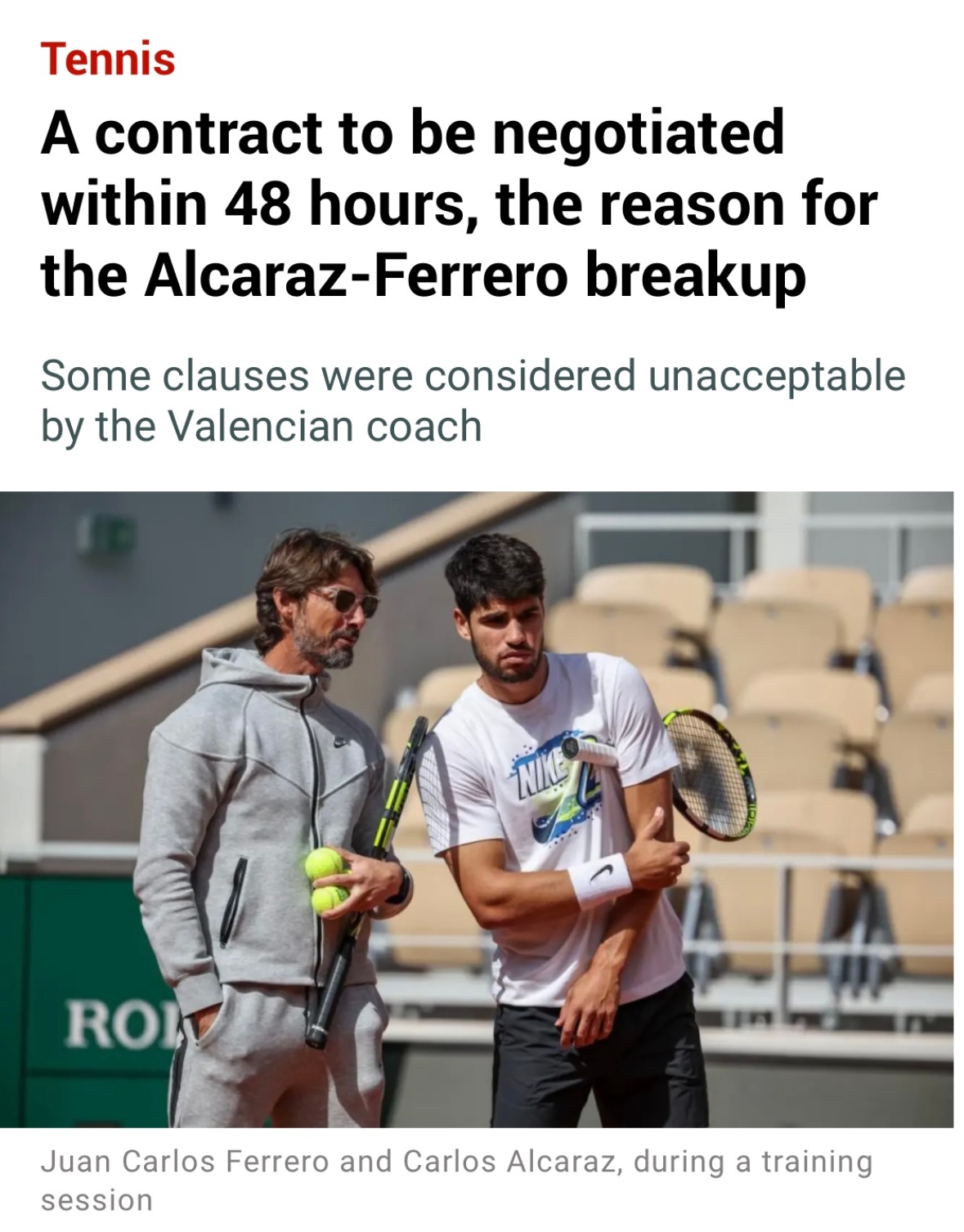 【48小时合约谈判】西班牙《马卡报》更新了阿尔卡拉斯和费雷罗分道扬镳的最新幕后故事,他们的报道称,费雷罗教练在上周六早晨收到了最新的合同,并且要在48小时之内决定是否接受这份新合同。据悉,在这份新合同里,费雷罗将面临大幅降薪,但这并不是阻碍双方继续合作的主要原因,费雷罗认为其他几项条款是自己无法接受的,《马卡报》的报道表示这几项条款都不是与网球直接相关的,正是这些不可调和的因素,最终造成了双方的分手。费雷罗是否接受新合同的截止期限是本周一,而结局就是他的拒绝,于是双方在本周三正式对外宣布了结束合作的决定,这一对从2018年开始的师徒组合也就此划上了句号……阿尔卡拉斯费雷罗结束合作