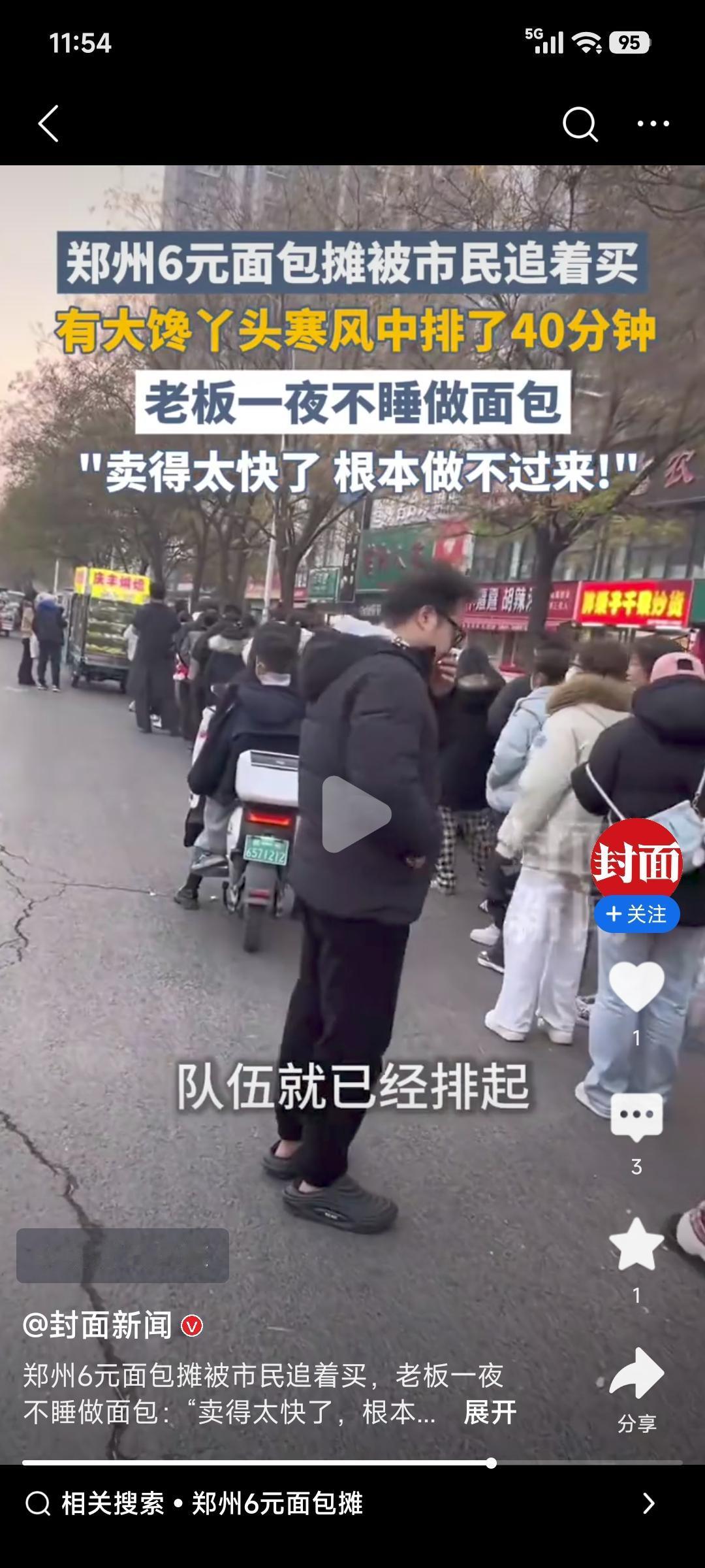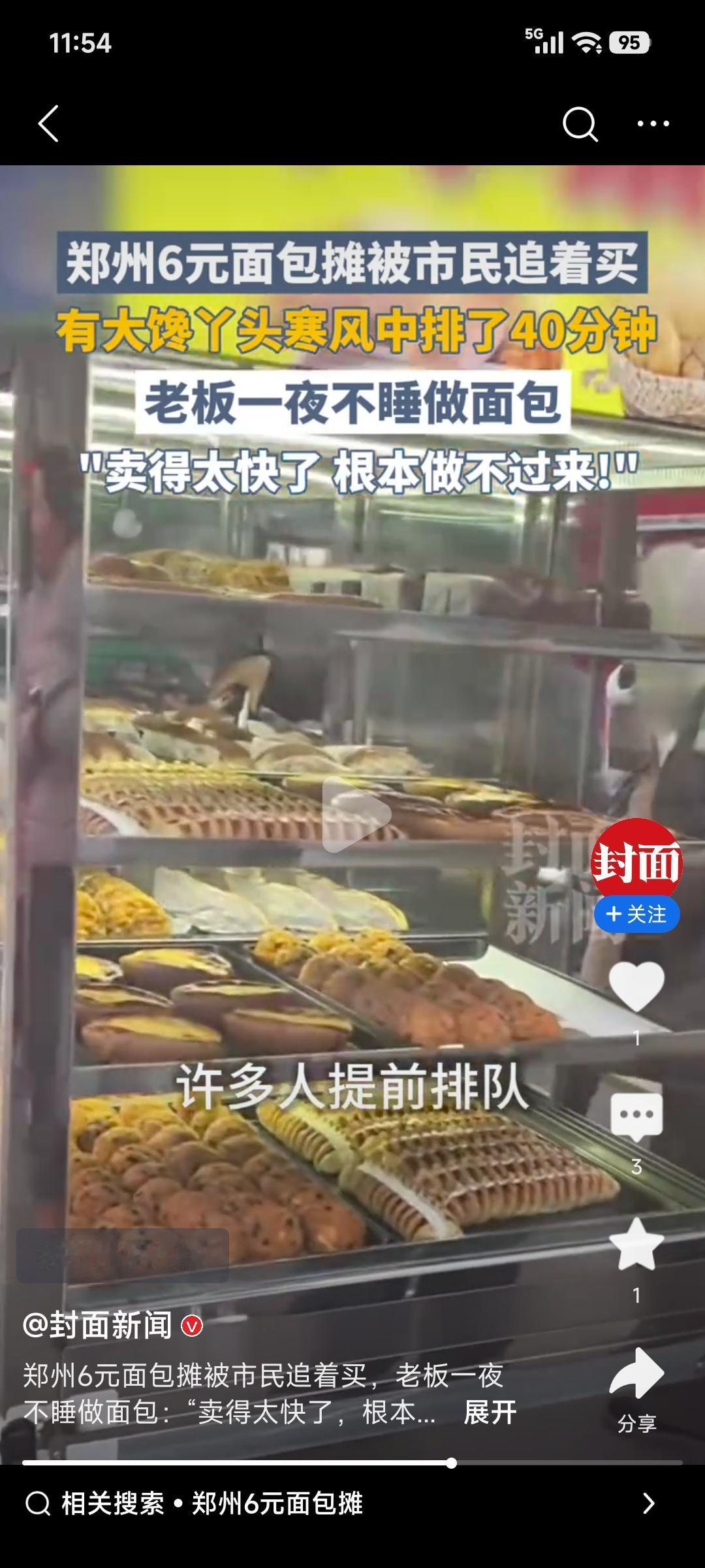 郑州一个6元面包摊爆火啦!这老板走红是因为一个骑电动车追着要“蓝莓面包”的小女孩。之后,好多市民都来打卡这个朴实的老式现烤面包摊。好多人提前排队,老板还没出摊,队伍就排起来了。 这面包价格很亲民,大多6元左右,最贵也就12元。突然爆火可把老板忙坏了,他直说“昨天都没睡觉,面包做不过来,卖得太快了”。因为连日疲惫,老板不得不提醒大家,明后两天休息,别跑空。这就是流量的威力啊,不过老板也得注意身体,劳逸结合才能长久。