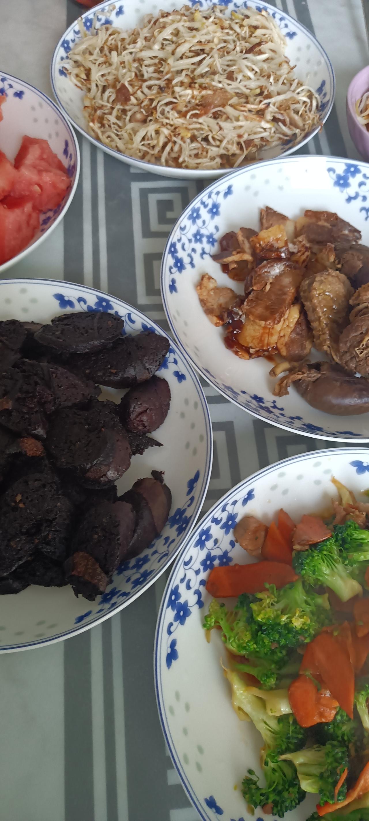 女儿说妈妈来了真好!最起码伙食不错! 每天中午女儿都回来吃午饭,我昨天没来,亲家母说就是将就的! 还有一根自己做的血肠,用煎锅煎了一下,挺好吃的,还没变味! 炒了个芥菜疙瘩咸菜,这个菜特别好做,还简单。但需要有好的刀功,必须切的特别细,然后用开水烫一下,把里边的那个盐水泡出来,攥干备用!热锅凉油,下入肉丝,再放入葱姜蒜,绝对不能放酱油,然后把咸菜条下锅,用中火煸炒,不用加盐,炒到咸菜丝变黄即可!特别好吃!还下饭! 另外又炒了个西兰花和胡萝卜片,比较清淡! 主食是豆包和大米饭,还有我起早在家做的酱大鹅,我带了点过来,满桌子的菜,确实还算丰盛吧! 我女儿说每个菜都好吃!妈妈手艺不错! 三十多岁了,啥都不会做,就知道吃!等我老了,做不动可咋整!