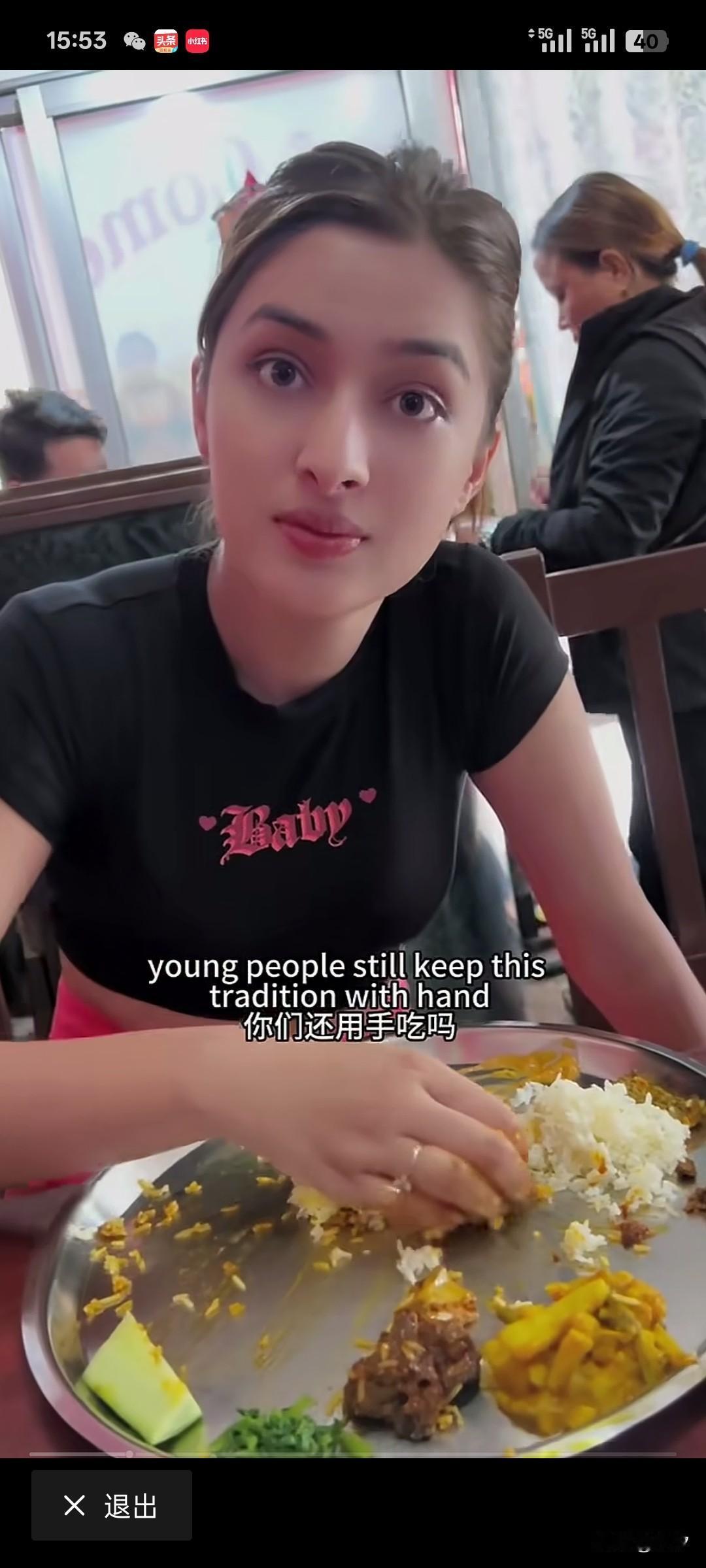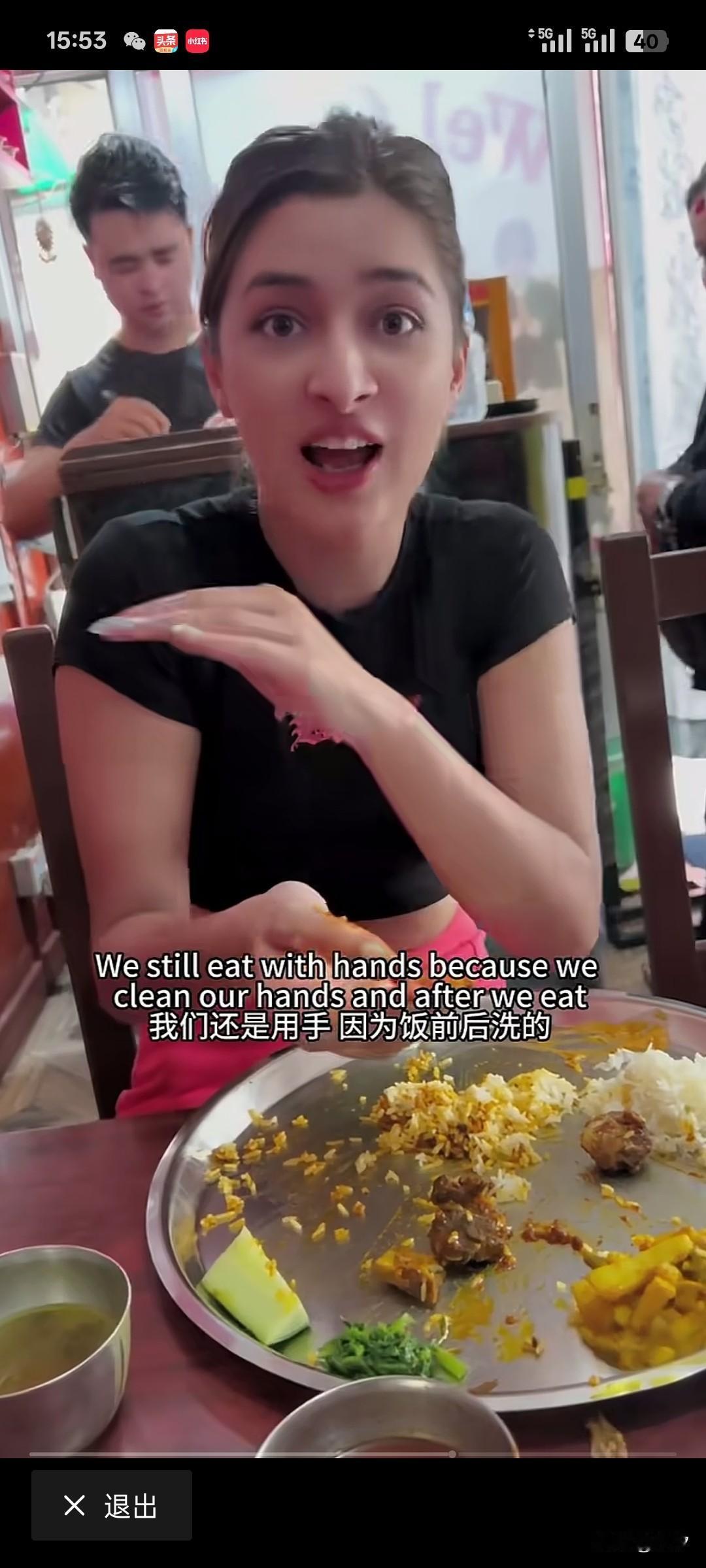 印度高种姓美女在吃印度餐, 坚持用手吃饭, 这么一位漂亮的女生, 很难想象用手在