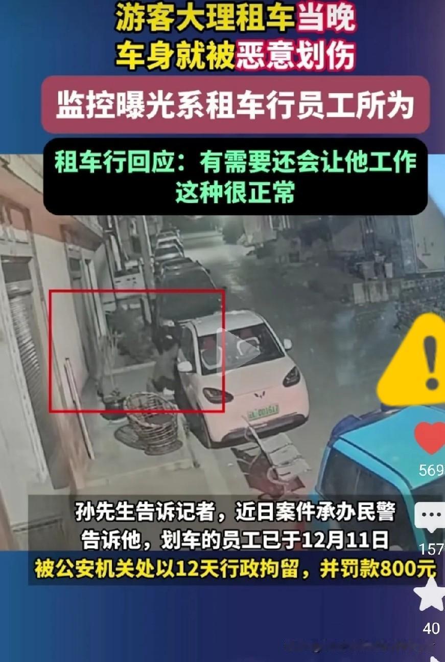 太恶心!大理租车行员工故意划车坑游客!这哪是划痕?是在刮云南旅游的脸! 大理这事儿真的把我看怒了! 游客花30块钱租辆车环洱海,晚上停路边没招谁没惹谁,结果租车行员工戴着帽子口罩,靠着GPS定位摸过来,对着车屁股哐哐划! 转天还车又是这个划车的员工验车,张嘴就要1000块赔偿!游客人生地不熟,只能认栽赔了600块。 要不是后来调了监控,这哑巴亏真是吃到家了! 现在警方只罚了员工800块、拘12天,租车行还嘴硬说是员工个人行为。 这话谁信啊?! 一个普通员工,吃饱了撑的半夜跑去划客户的车?没有老板指使,他能拿到车辆GPS?敢用这种损招坑钱? 这根本不是简单的故意损坏财物,这是明晃晃的敲诈勒索! 30块钱一天的车,看着便宜,其实全是陷阱!就等着游客上车,然后制造“事故”狠宰一刀! 这种黑心车行,就应该追究刑事责任,不光要把老板揪出来,工商部门更该直接吊销执照,让它彻底从大理消失! 云南的蓝天白云、洱海苍山,不是给这些蛀虫用来宰客的! 一颗老鼠屎坏一锅汤,今天纵容一家黑心车行,明天毁的就是整个云南的旅游招牌! 必须严查!绝不姑息! 你们平时生活中遇到过租车陷阱吗?评论区聊聊! 大理租车坑人 洱海租车避坑 租车行员工划车敲诈 旅游乱象零容忍