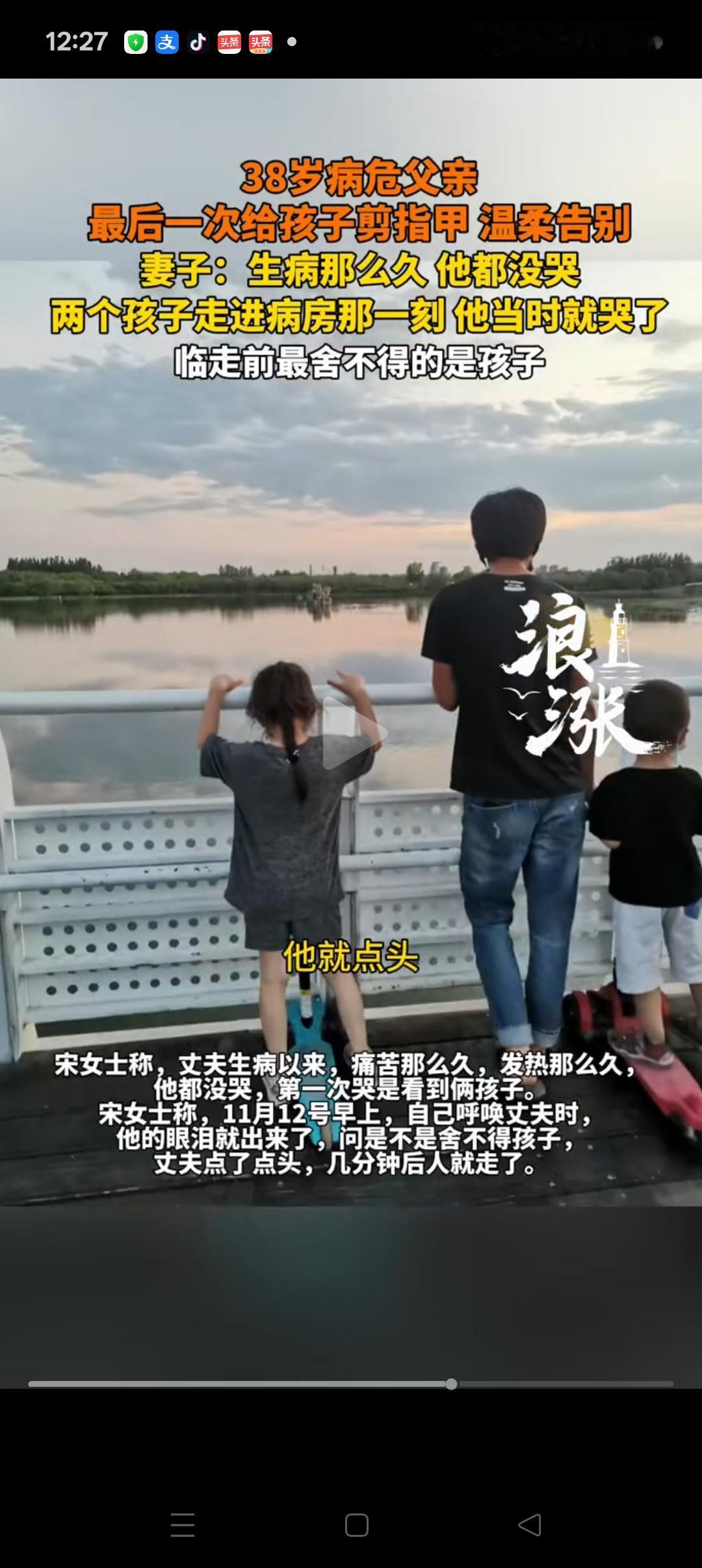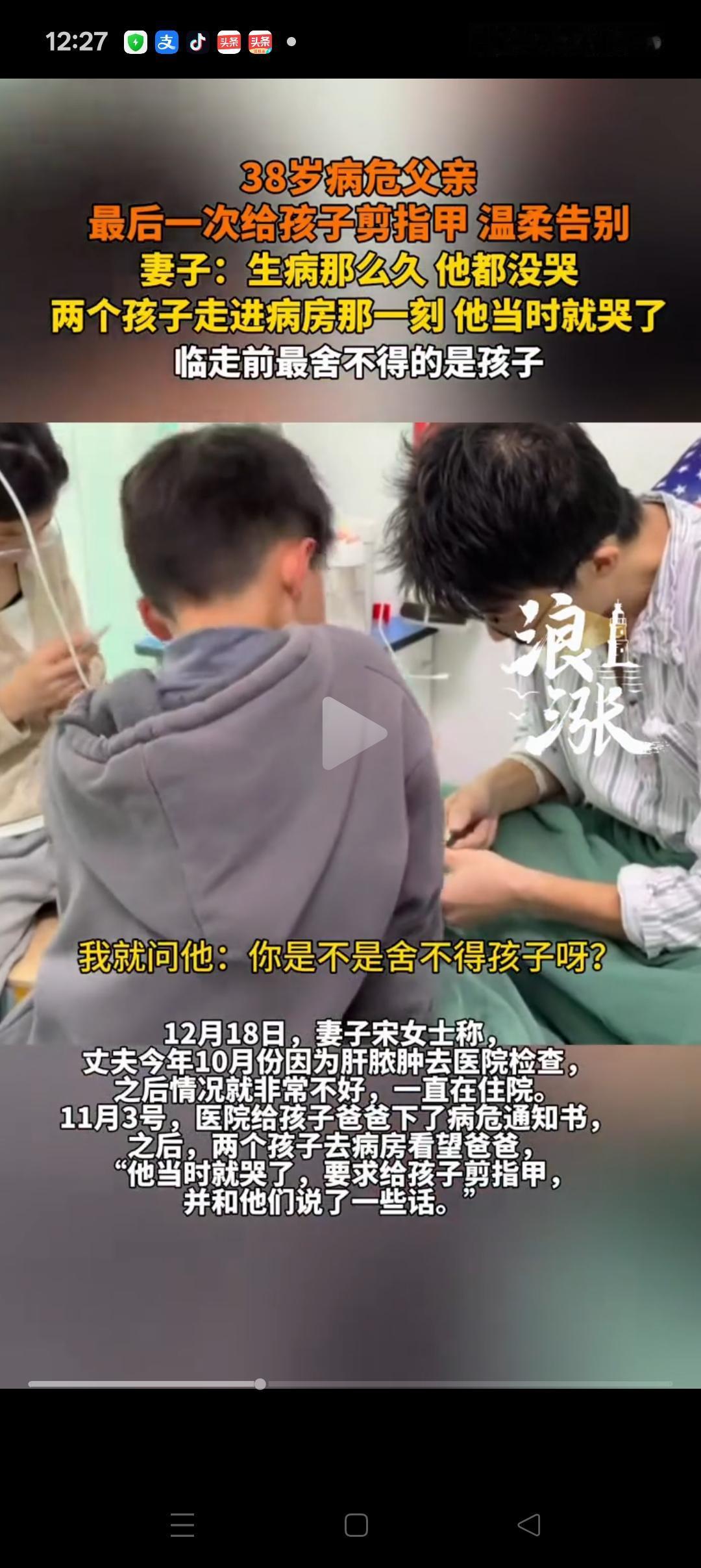 “一个父亲最后的不舍[流泪]”,河北,一位38岁爸爸被下了病危通知书,等他看到两个孩子时,哭了,说想给孩子剪指甲。剪完指甲后,还和两个孩子意味深长的说了许多话。 后来两个孩子离开后,老婆问他:是不是舍不得孩子。他也没说话,只是点点头,过几分钟就走了。 妻子说:老公是个很坚强的人,10月份查出来肝脓肿后,就一直在接受治疗,也从来没哭过。 突然想起发小,当初出了车祸,一家老小就在医院陪着,他也是说不出话,只是望着他女儿。他女儿一直握着他的手,还给他擦眼泪,半个小时不到就走了。 其实每个人并不是怕死,而是放不下内心的那份牵挂,特别是孩子,想陪着他们长大[流泪][流泪]