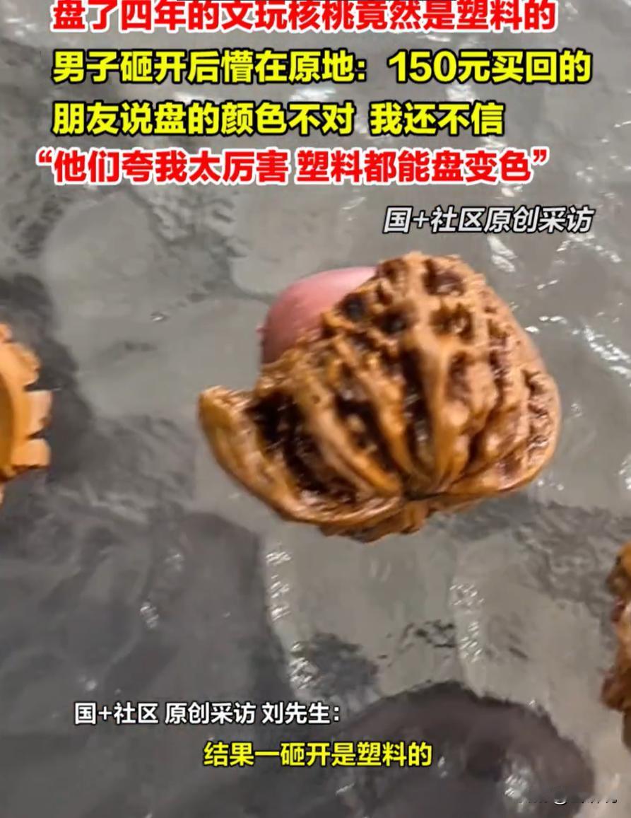 伤害性不高侮辱性极强!河北唐山,男子盘了四年文玩核桃,结果给朋友展示时,对方一眼就指出他这个有问题,一开始男子还不信,结果砸开一看,才发现是塑料的,盘了四年就算了,当初他还花了150块钱购买的。 在文玩圈里,盘核桃讲究的就是个“功夫”,日夜摩挲、汗油浸润,看着核桃从浅棕色慢慢变得红润透亮,包浆越来越厚重,那种成就感可不是一般东西能比的。 刘先生对这个理儿深信不疑,四年前从市场上淘回这对核桃后,就彻底入了迷。当初买的时候,他还跟摊主磨了半天嘴皮子,把价格从180砍到150,付款的时候还美滋滋的,觉得自己不仅眼光独到,还会精打细算,花小钱淘到了好东西。 从那以后,这对核桃就没离开过他的手。上班的时候揣在口袋里,午休间隙掏出来盘一会儿;下班回家坐在沙发上,一边看电视一边摩挲;就连出门遛弯,也得攥在手里。时间久了,核桃的表面确实变得油光锃亮,颜色也深了不少,摸起来温润顺滑。 刘先生更是得意,逢人就炫耀自己的“成果”,还总结出一套“盘核桃修身养性”的理论,专门用来应付老婆吐槽他“玩物丧志”。在他眼里,这哪儿是核桃啊,分明是潜力股,等盘到包浆更厚重的时候,说不定能估个好价钱,就算不卖,留着当家里的“传家宝”也合适。 他这股子痴迷劲儿,身边人都看在眼里,没人好泼他冷水。直到前阵子,一位懂行的朋友来家里串门,刘先生又兴冲冲地把核桃拿出来展示,想让朋友夸夸自己的手艺。没成想,朋友接过核桃,只仔细看了几眼,又掂了掂分量,表情就变得耐人寻味起来。朋友直言,这对核桃不对劲,看着就不像真的。 刘先生一听就不乐意了,当场反驳。他说自己天天盘天天摸,这手感还能骗人?假的能盘出这么温润的包浆和透亮的颜色吗?在他看来,自己花了四年时间养出来的东西,比谁都清楚好坏,朋友这是没眼光,乱说话。朋友见他不信,也没再多争辩,只说了句:“真核桃里面有仁,是空的,假的大多是实心的。你要是真不信,就找个锤子砸开看看,一砸就知道真假了。” 这话可把刘先生的好胜心给激起来了。他觉得朋友这是在质疑自己的眼光,也质疑自己四年的心血。既然话都说到这份上了,索性就砸开求个痛快,也好让朋友心服口服。当时他心里还存着一丝侥幸:万一这核桃是个变异品种,里面就是实心的呢?抱着这个想法,他找来了锤子,深吸一口气,对着其中一颗核桃就砸了下去。 “咔嚓”一声响,预想中清脆的核桃开裂声没出现,反而传来一阵发闷的“噗噗”声。随着壳体裂开,刘先生的脸色瞬间就变了,里面露出来的根本不是期待中的核桃仁和空腔,而是一团颜色跟核桃外皮差不多的、严丝合缝的实心塑料。那一瞬间,刘先生整个人都僵住了,尴尬、愤怒、无奈各种情绪混在一起,最后竟忍不住自己气乐了。 旁边的朋友早就笑得前仰后合,一边笑一边调侃他:“你这手艺可太牛了,能把几块钱的塑料盘出玉质感,这水平在文玩圈里都少见,完全可以开班教学了!”刘先生听着朋友的调侃,脸上火辣辣的,心里别提多憋屈了。感情自己这四年天天摩挲的,不是什么文玩宝贝,竟是个不值钱的塑料疙瘩。 后来他才知道,现在文玩圈的造假技术有多“鸡贼”。那种几块钱成本的塑料或者十来块钱的树脂,经过简单的上色、配重,就能模仿出真核桃的外观和手感,甚至连盘玩时的包浆反馈都能模仿得七七八八。单纯靠摸和看表面,很容易栽跟头。刘先生回想起来,其实早有破绽,比如这对核桃的纹路工整得过分,就像复印出来的一样,自然界里根本不可能有这么一模一样的两颗核桃。 更让他郁闷的是,当初买这对核桃花的150块钱。虽说150块不算巨款,但一想到自己花150块买了个塑料疙瘩,还当成宝贝盘了四年,就觉得被狠狠“羞辱”了一番。他这才明白,文玩圈里那种“花小钱买精品”的心态,往往就是踩坑的根源。自己当初要是不那么盲目自信,稍微动点心眼检查一下,也不至于吃这么大的亏。 比如拿个打火机远远烤一下,闻闻有没有塑料的刺鼻味儿;或者把两颗核桃轻轻碰一碰,听听是不是塑料碰撞的沉闷声;再或者仔细看看纹路,发现它们长得像双胞胎就多留个心眼。这些简单的方法,随便用一个,都能避免这场持续四年的笑话。 现在刘先生再看到那对被砸开的塑料核桃,就觉得又好气又好笑。他说,盘塑料不丢人,能把塑料盘变色也算是个“本事”,但这事给了他一个深刻的教训:时间能证明你一直在努力,却证明不了你手里的东西一定是真的。以后再碰文玩,与其迷信自己的手感和所谓的“包浆”,不如多相信点客观常识。这四年的“笨功夫”,就是为自己的盲目自信交了一笔昂贵的学费。