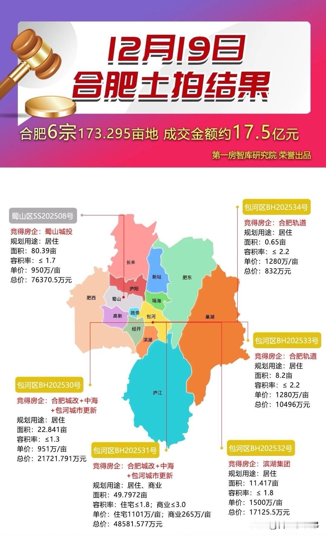 今日,合肥土地市场迎来一场备受关注的土拍活动,经过激烈角逐,6宗地块全部成功出让,总成交面积超过173亩,成交额约17.5亿。[赞]