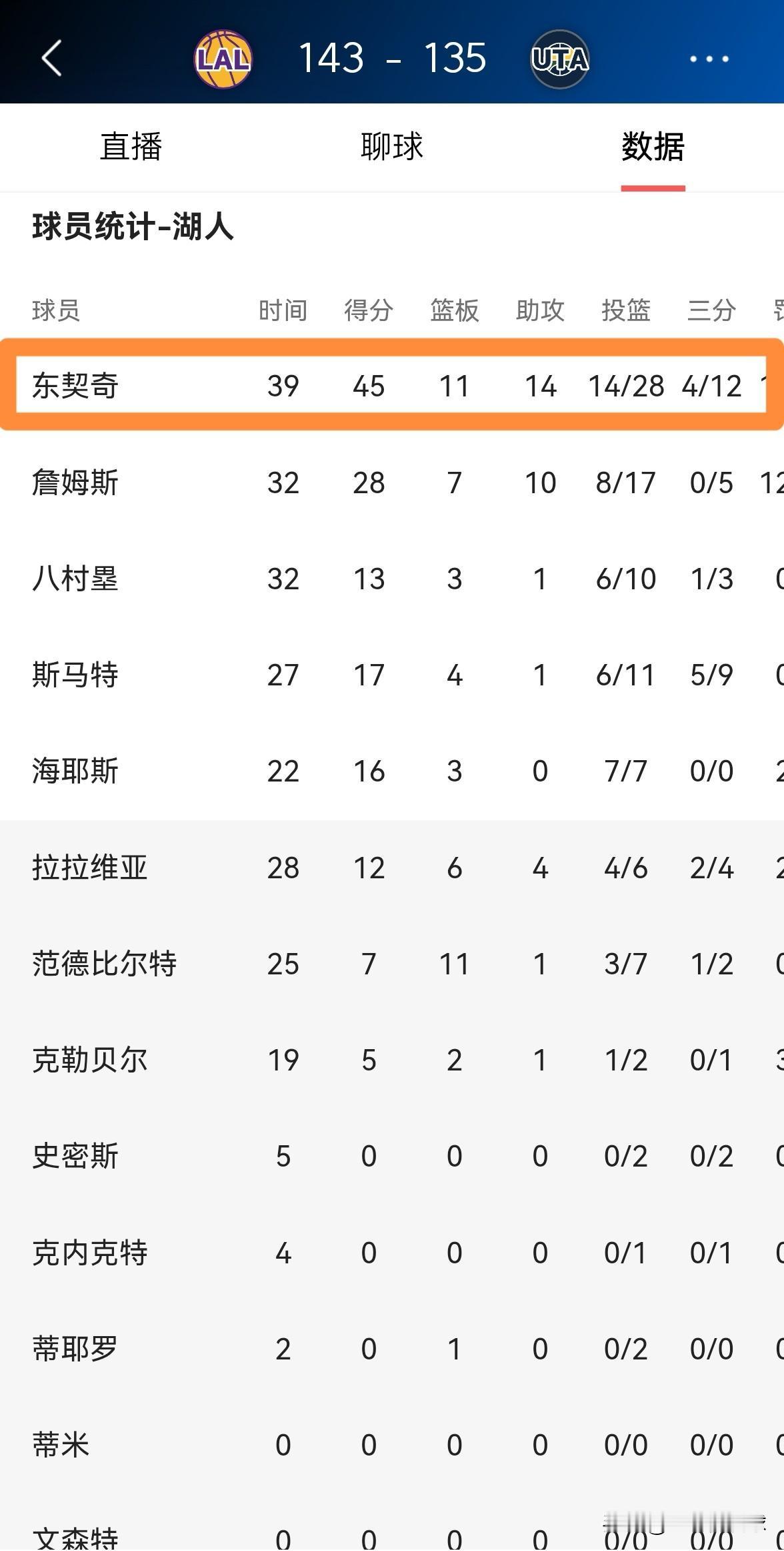 湖人超级巨星詹姆斯真是太会拍马屁了!在今天湖人客场以143:135战胜爵士的赛后采访中,詹姆斯大赞队友东契奇的精彩表现,詹姆斯这样说道:“他可是卢卡,魔术师卢卡,他就是这么棒,出色的不可思议。” 我相信当东契奇听到NBA历史得分王如此盛赞自己时,东契奇一定会开心极了,毕竟这样的称赞来自于NBA历史最佳球员之一的詹姆斯。