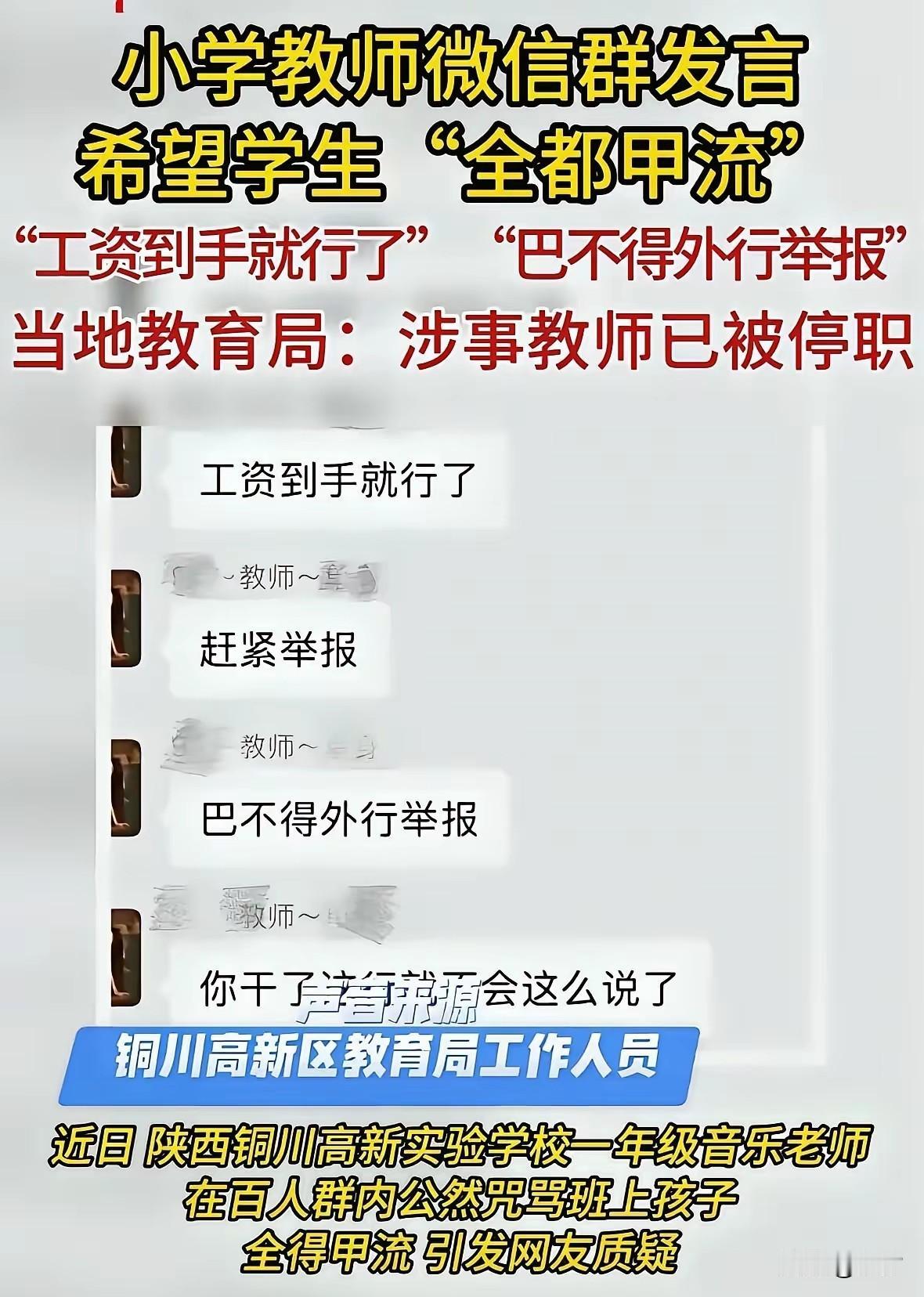小学老师诅咒学生全得流感后续来了, 当地教育局把她停职反省了, 不知道工资有没有停发? 如果说停职期间依旧发工资, 那可真是莫大的讽刺, 毕竟人家都说了, 只要工资到账就行, 女生的身份也被扒, 家庭条件非常好, 平时生活也非常小资, 看她自己发布的照片, 该女子长得还不错, 但没想到心地那么恶毒, 居然诅咒自己的小学生, 还让人家都得流感, 都回家去吧, 如果没有学生上学, 那还要老师干什么? 幸亏她只是个音乐老师, 要是她是个主课老师, 那当地的教育可真的完了, 记得当老师好像有心理测试, 不知道这位老师的心理测试是怎么通过的?毕竟情绪不稳定的人不适合当小学老师!大家对于该小学老师的过分言论怎么看? 小学老师 教师对学生施暴 教师被处理 教师遭举报 女教师举报学校