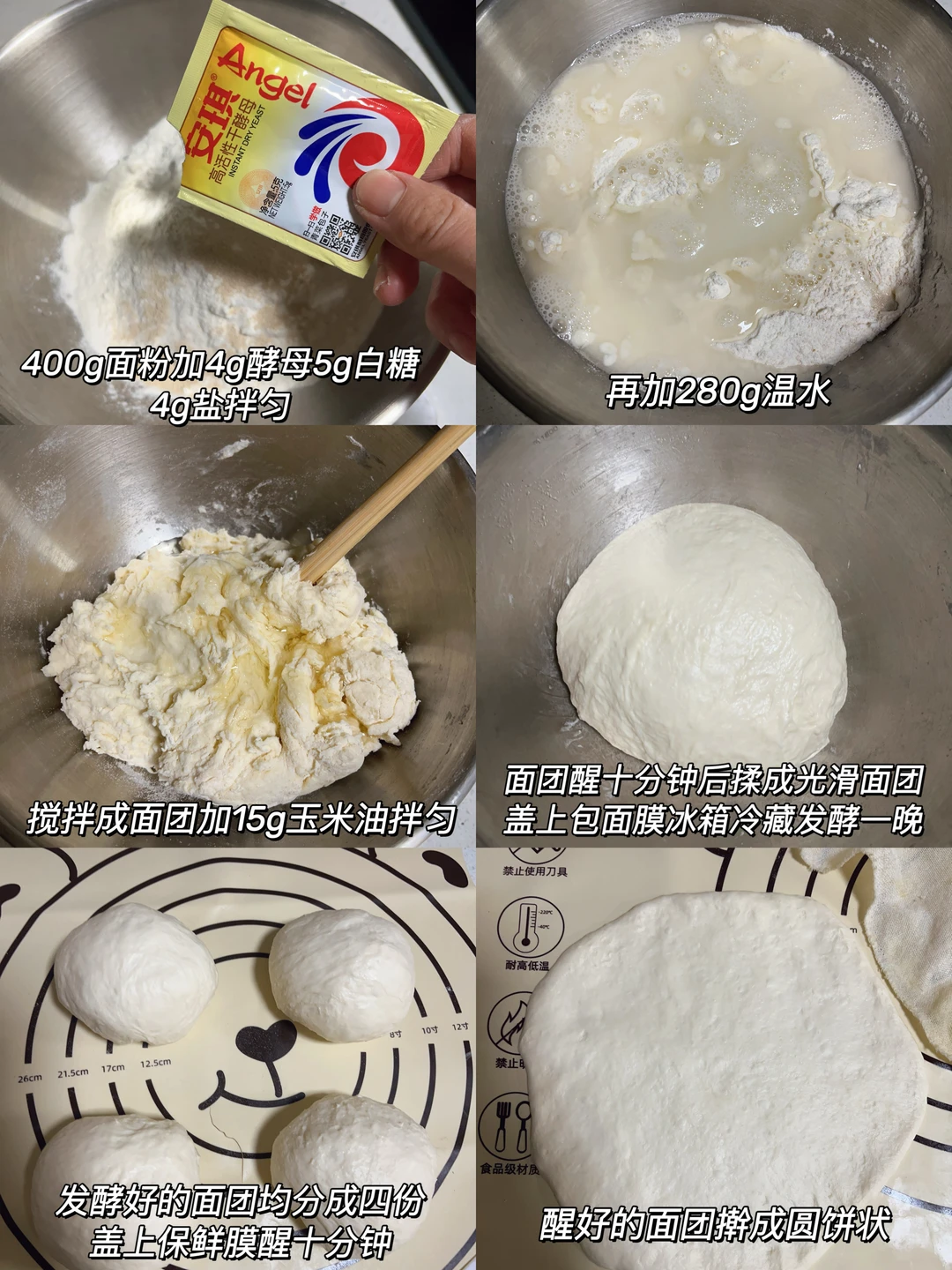 1⃣️面粉加盐和糖、酵母拌匀,然后加280g温水搅拌至无干粉状态,面团加15g玉米油醒面十分钟后再把面团搅拌成光滑面团,放冰箱冷藏发酵一晚