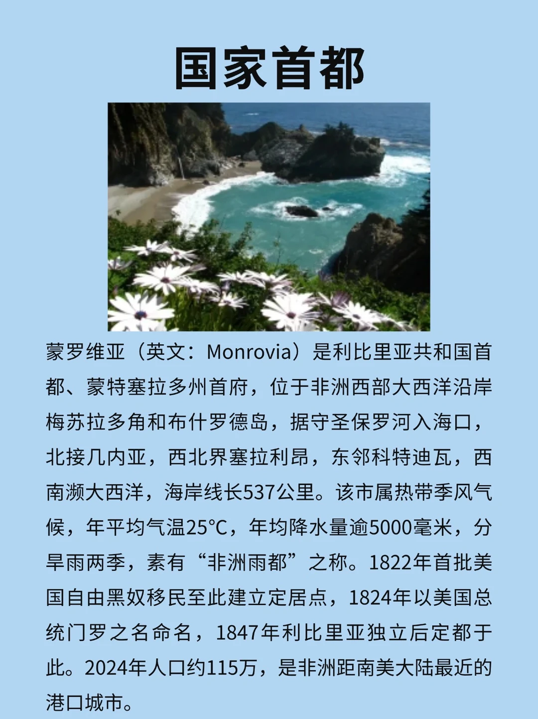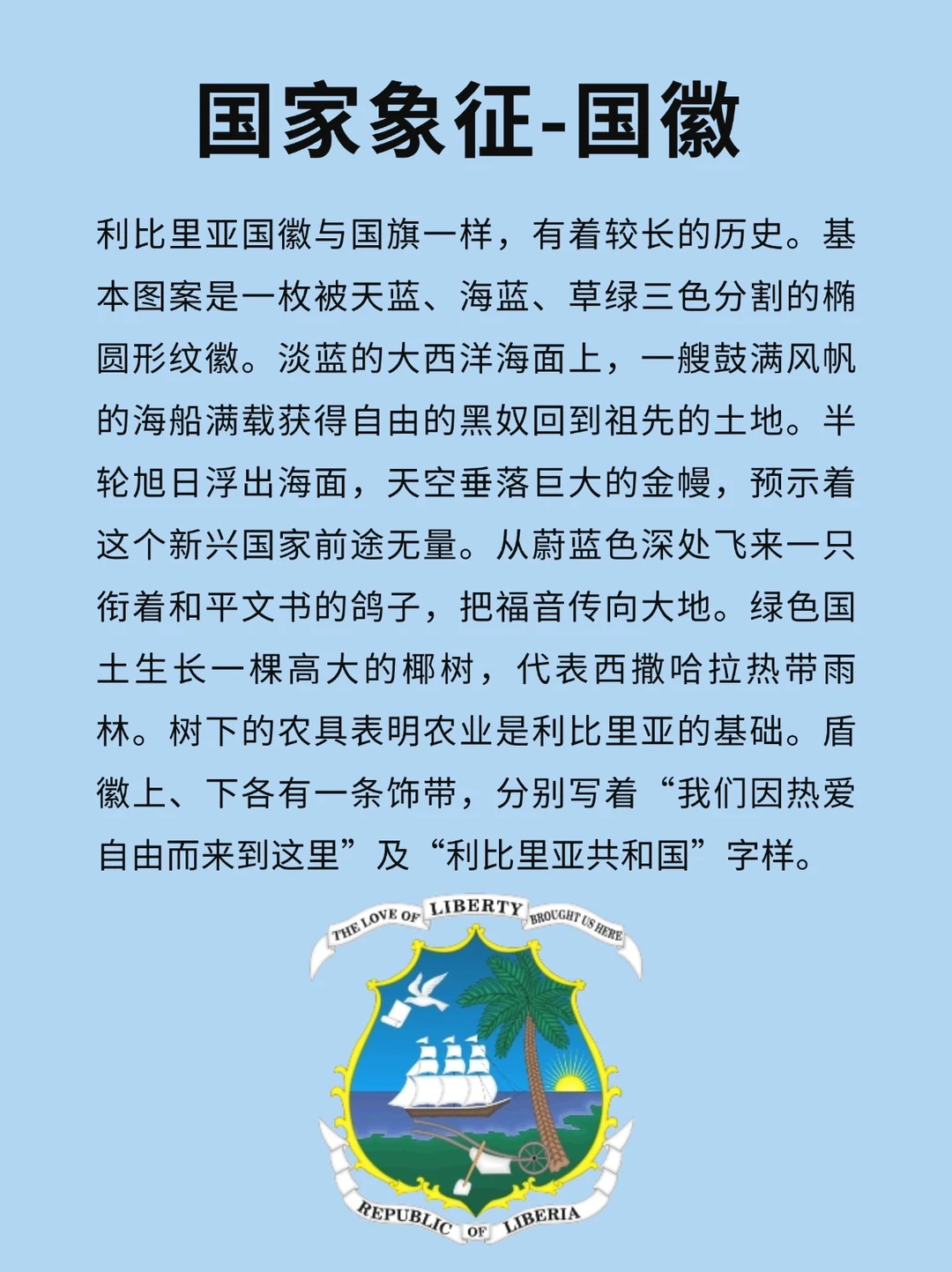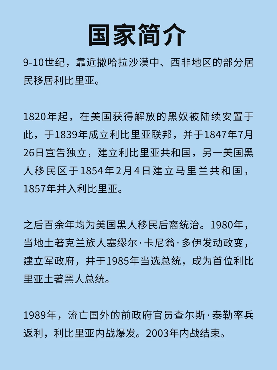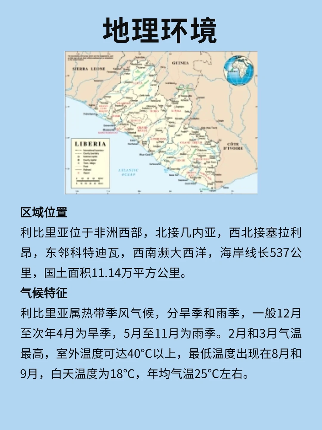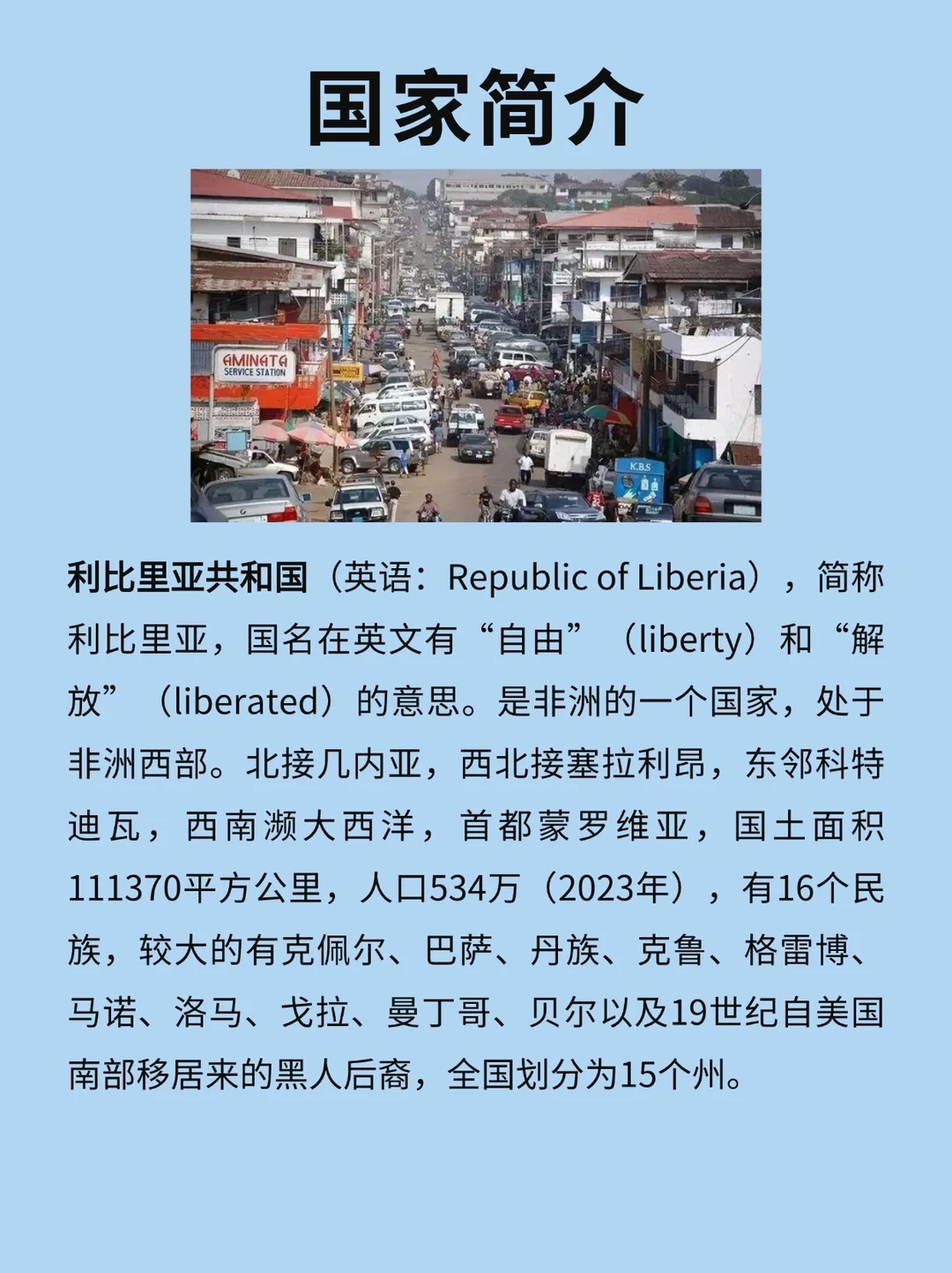 [打卡R]利比里亚共和国(英语:Republic of Liberia),简称利比里亚,国名在英文有“自由”(liberty)和“解放”(liberated)的意思。 是非洲的一个国家,处于非洲西部。北接几内亚,西北接塞拉利昂,东邻科特迪瓦,西南濒大西洋,首都蒙罗维亚,国土面积111370平方公里,人口534万(2023年)。 有16个民族,较大的有克佩尔、巴萨、丹族、克鲁、格雷博、马诺、洛马、戈拉、曼丁哥、贝尔以及19世纪自美国南部移居来的黑人后裔,全国划分为15个州。 -