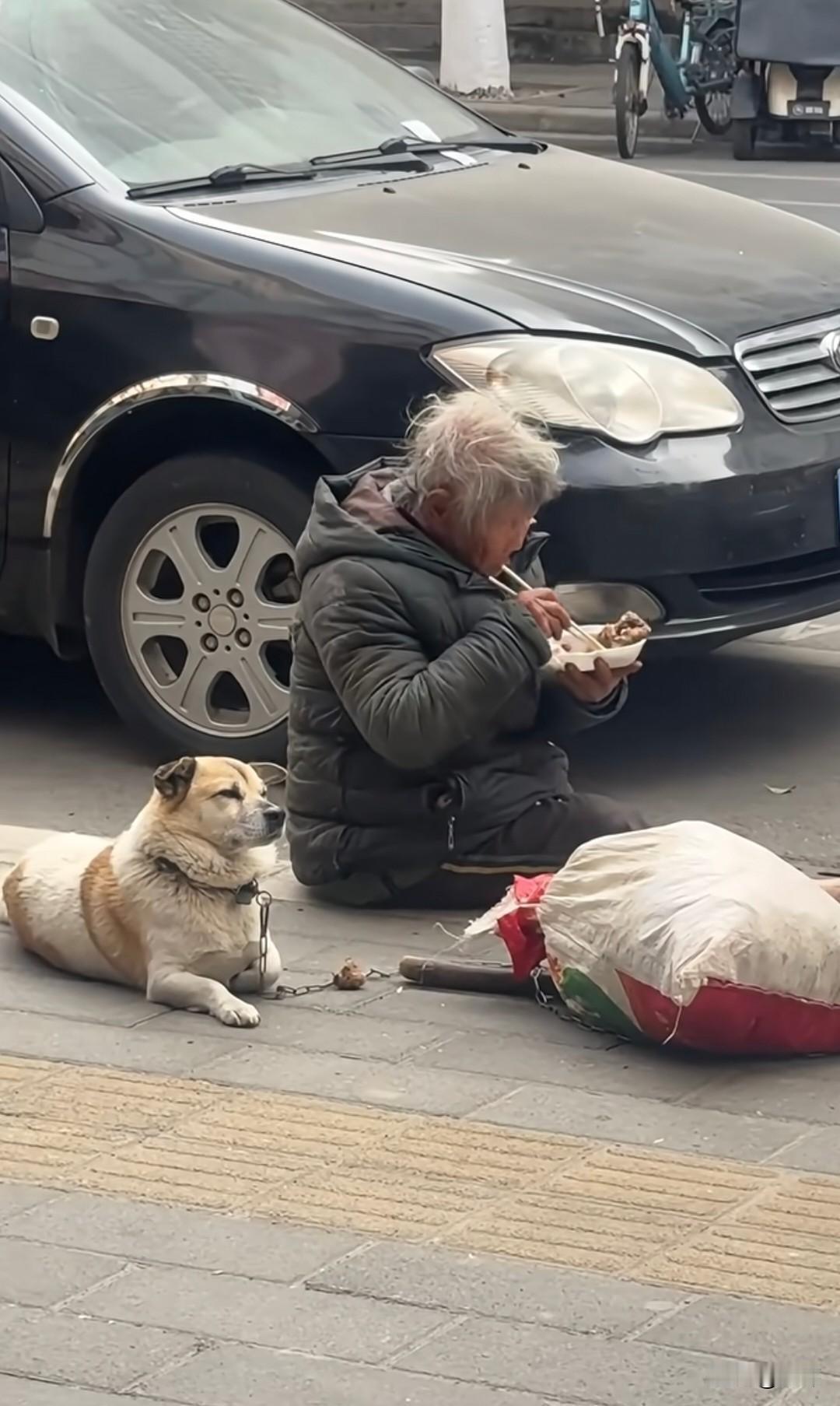 泪目了!这天,一位小姐姐去逛街,结果走到一条商业街上的时候,看到了无比凄惨的一幕,一位居无定所,衣衫褴褛的老人坐在地上吃着捡来的盒饭,她的旁边趴着一只狗狗,估计是她收养的。 这只狗狗不离不弃的跟着老人,也不嫌弃老人的贫穷,它的心里只有老人,老人边吃也会夹一些饭菜给狗狗吃,她真的是自己有什么就给狗狗什么,虽然贫穷但也没亏待狗狗。这一幕令小姐姐非常感动,于是上前递给老人一些钱,希望能让她买点吃的,老人却婉言谢绝,说自己能够赚到钱,只要有的吃就可以,这只狗狗是她收留的流浪狗,跟着自己很多年了。 不过最终小姐姐还是悄悄的把钱放在了她的身旁,然后躲在角落看着老人,老人拿了钱,抹着泪望了望四周,小姐姐这才放心的离去。