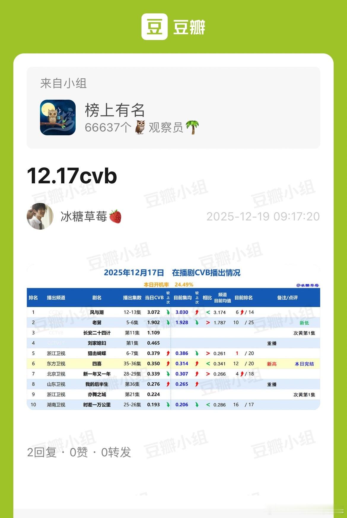 12.17CVB收视率风与潮 集均3.03,央一第六老舅 集均1.928,暂央八第十长安二十四计 集均需等周榜狙击蝴蝶 0.386暂浙江年冠👑时差一万公里 集均0.206,湖南卫视倒二