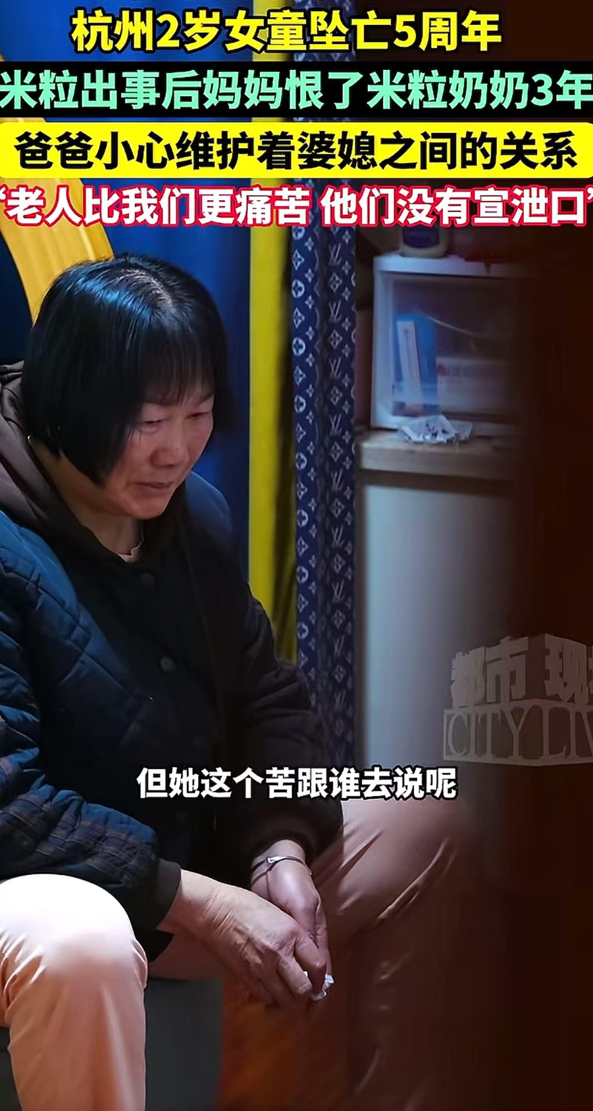 杭州2岁女童坠亡 出事后妈妈恨了奶奶3年 爸爸说,老人比父母更痛苦,他们没有宣泄口 这句奶奶更痛苦,又一次深深地扎了媳妇一刀。奶奶的孩子还在,可是妈妈的孩子不在了,最痛苦的还是妈妈吧! 直到现在5年过去了,小米粒还没有火化,妈妈说这么小火化了是没有东西留下的,她不舍得。 爸爸说心疼老婆,但也心疼妈妈,几年来小心维护着婆媳之间的关系。很人多问他为什么不离婚,他回答:如果离婚了,真的就能隔离痛苦吗? 亲生的和亲自生的,一字之差,天地差别。
