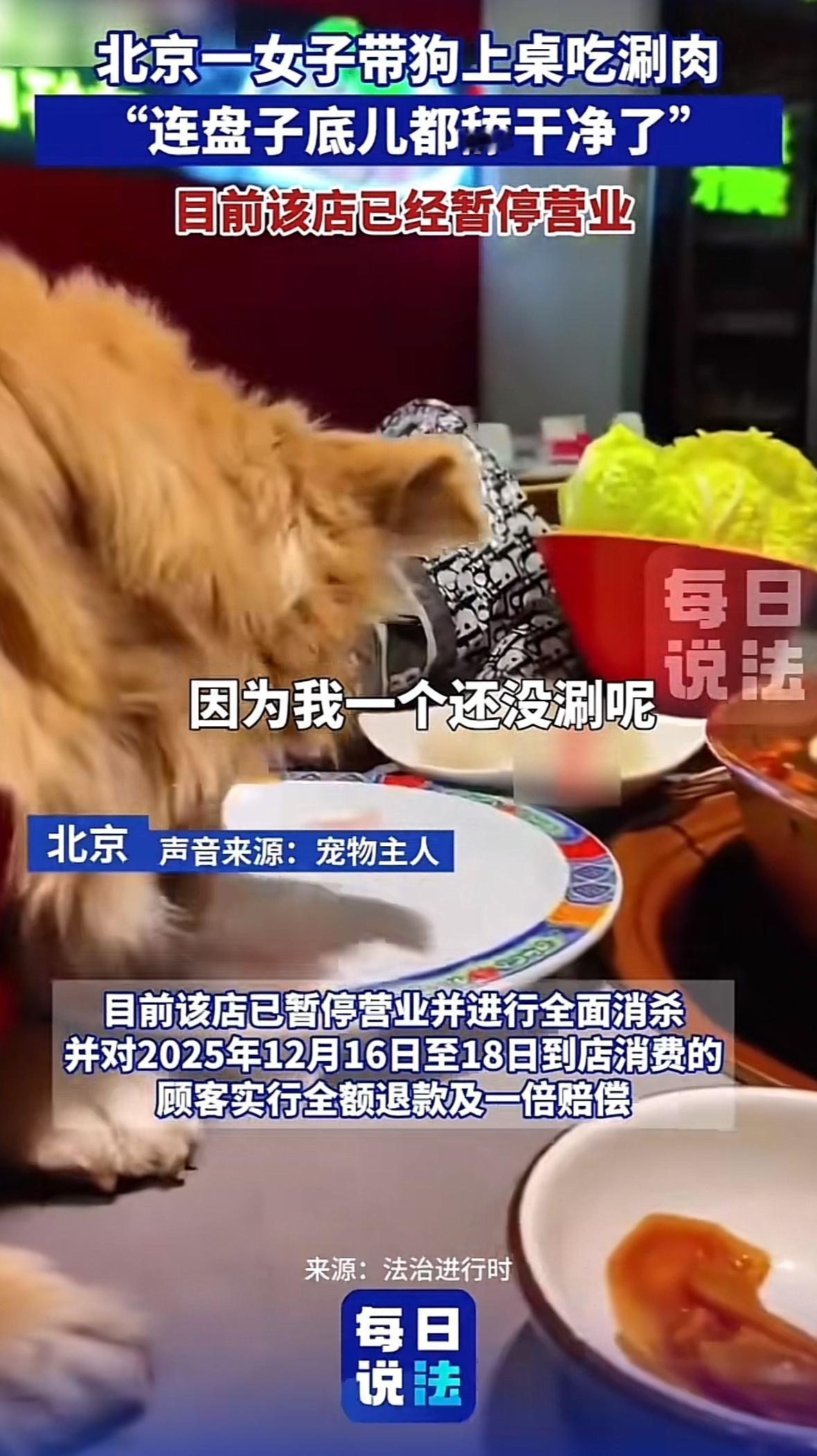这下出名了 纵容狗上桌舔盘子, 还发视频炫耀,夸自己家的狗,“太棒了”真让人无语。 把狗当家人,在家咋宠都行,可公共场合就不一样了。狗身上细菌多,它舔过的盘子,谁还敢用?那家涮肉馆,估计往后都没人敢去。好在商家对当天顾客做了1倍赔偿。 不少网友提议,商家该学学海底捞处理小孩尿尿事件,起诉这位女士,让她承担赔偿。不禁让人琢磨,她是不是跟某些精致利己的人一样,在家都未必让狗舔盘子,却在公共场合这么干。