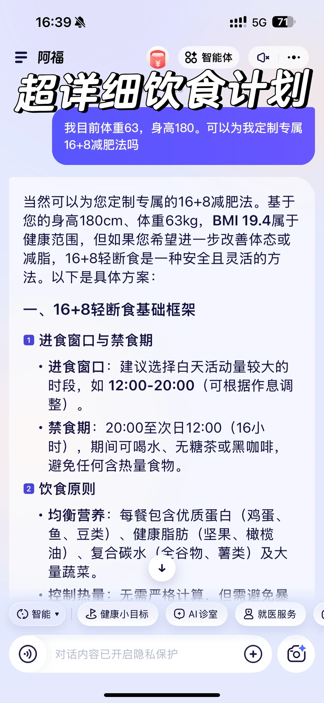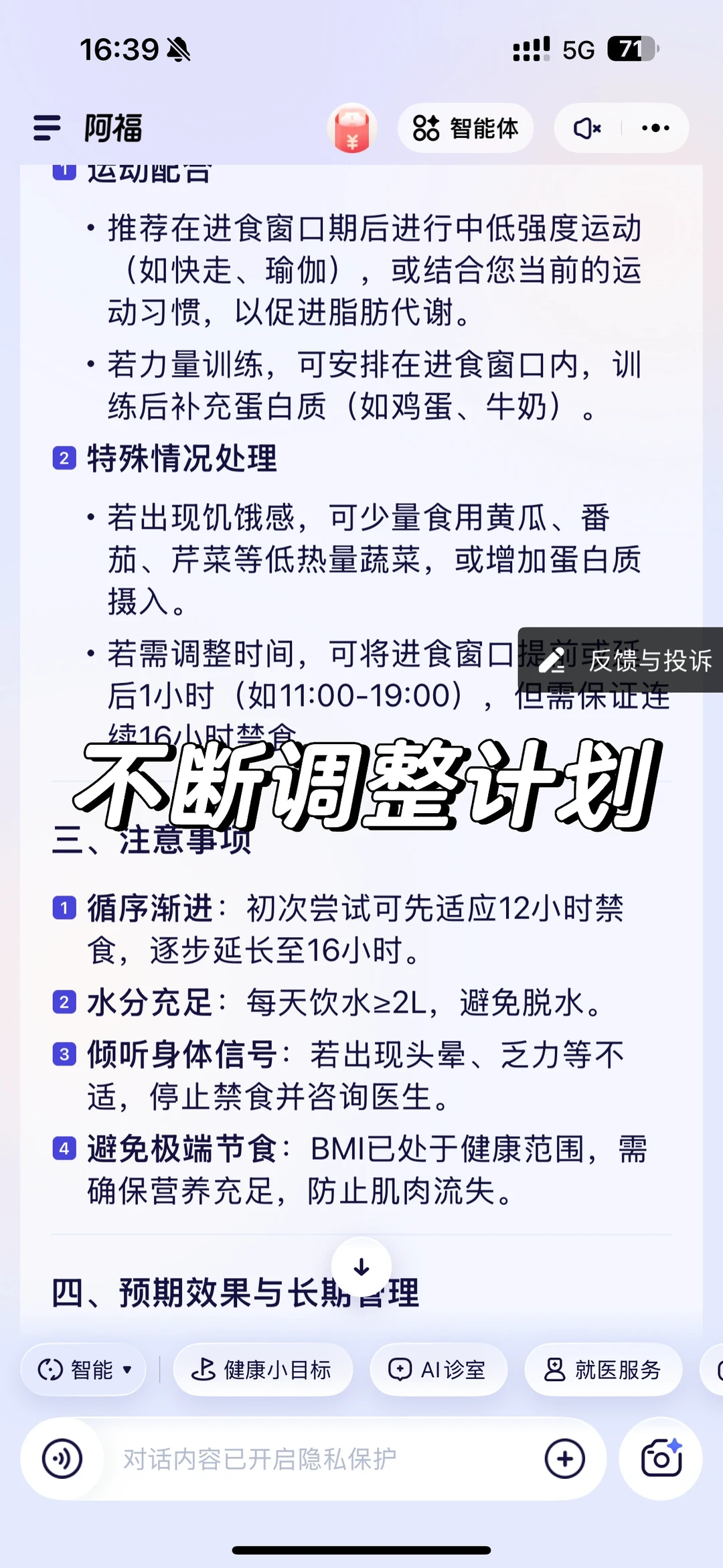 我不仅在阿福建立了自己的健康档案,还设置了小目标以及饮食计划!按照阿福给的16加8减肥法时间表,执行了一段时间,感觉离自己最终的目标越来越近了!