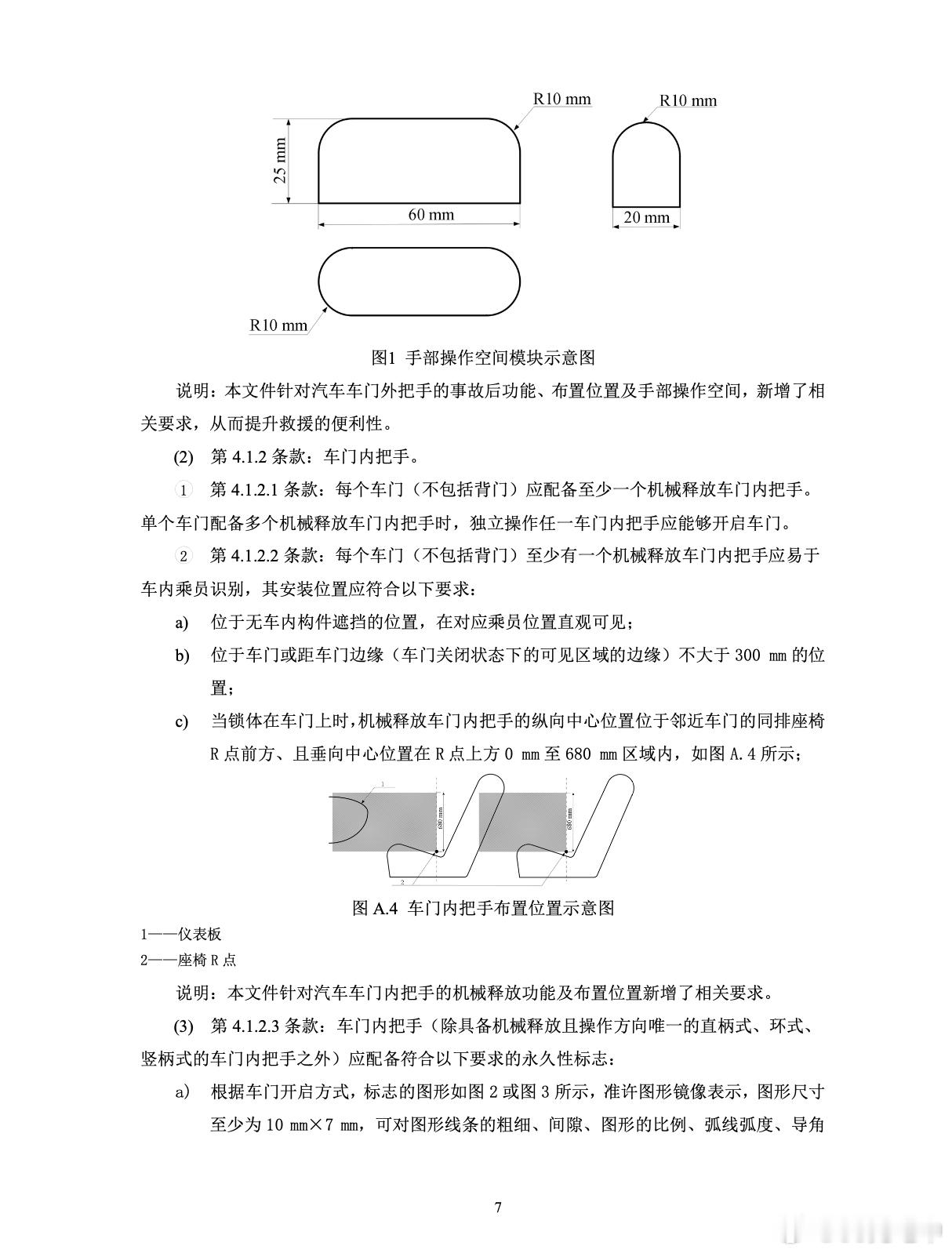 明确禁止全隐藏式门把手 看了一下《汽车车门把手安全技术要求》(报批稿)。(报批稿:经过内部审查、修改后的最终草案,准备上报给上级主管部门或领导进行审批(报批)的文稿。一旦获批,即可正式发布或实施。)这里面有 2 个点:1. 每个车门(不包括背门)应配备机械释放车门外把手,而且还要求当发生不可逆约束装置展开或动力电池热扩散等事件后, 能够在不借助工具的情况下, 通过机械释放车门外把手开启车门;2. 车门外把手在任意状态时,相对车身表面应具备操作机械释放功能的手部操作空间,需要满足 60 mm x 25 mm x 20 mm 的空间要求。第一点意味着凯迪拉克锐歌、福特 Mach-E 、特斯拉 Cybertruck 这种都是不合规的。第二点意味着所有隐藏式门把手,蔚来、理想、小鹏啥的都是不合规的。新的强制性国家标准下,必须有机械结构,且有手能伸进去操作的空间。新的标准,除了操作空间要求这一点,2027 年 1 月 1 日正式实行。包含操作空间要求的 2028 年 1 月 1 日正式实行。已经获批正在销售的车型 2029 年 1 月 1 日需要完成整改。也就是说 29 年开始市面上销售的所有车型就都是非隐藏式+有机械结构的门把手了。