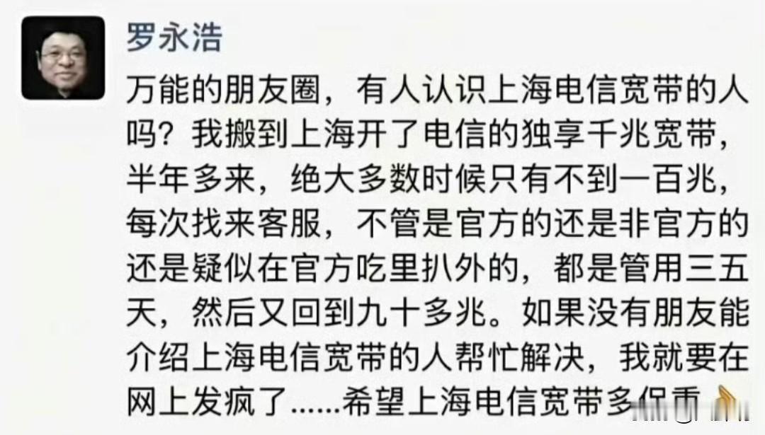 终于有人吐槽宽带缩水了。最近,罗永浩在朋友圈吐槽电信宽带问题,说自家开通的是独享千兆宽带,结果大多数时候都一百兆。 每次找客服后,网速能短暂恢复到千兆,但几天后又掉到百兆。 我家也有类似的问题,好多次发现凌晨网速就会变慢,等白天时又恢复正常。 虽然这没什么大问题,但有时候晚上想熬夜看剧时,真的很磨人。
