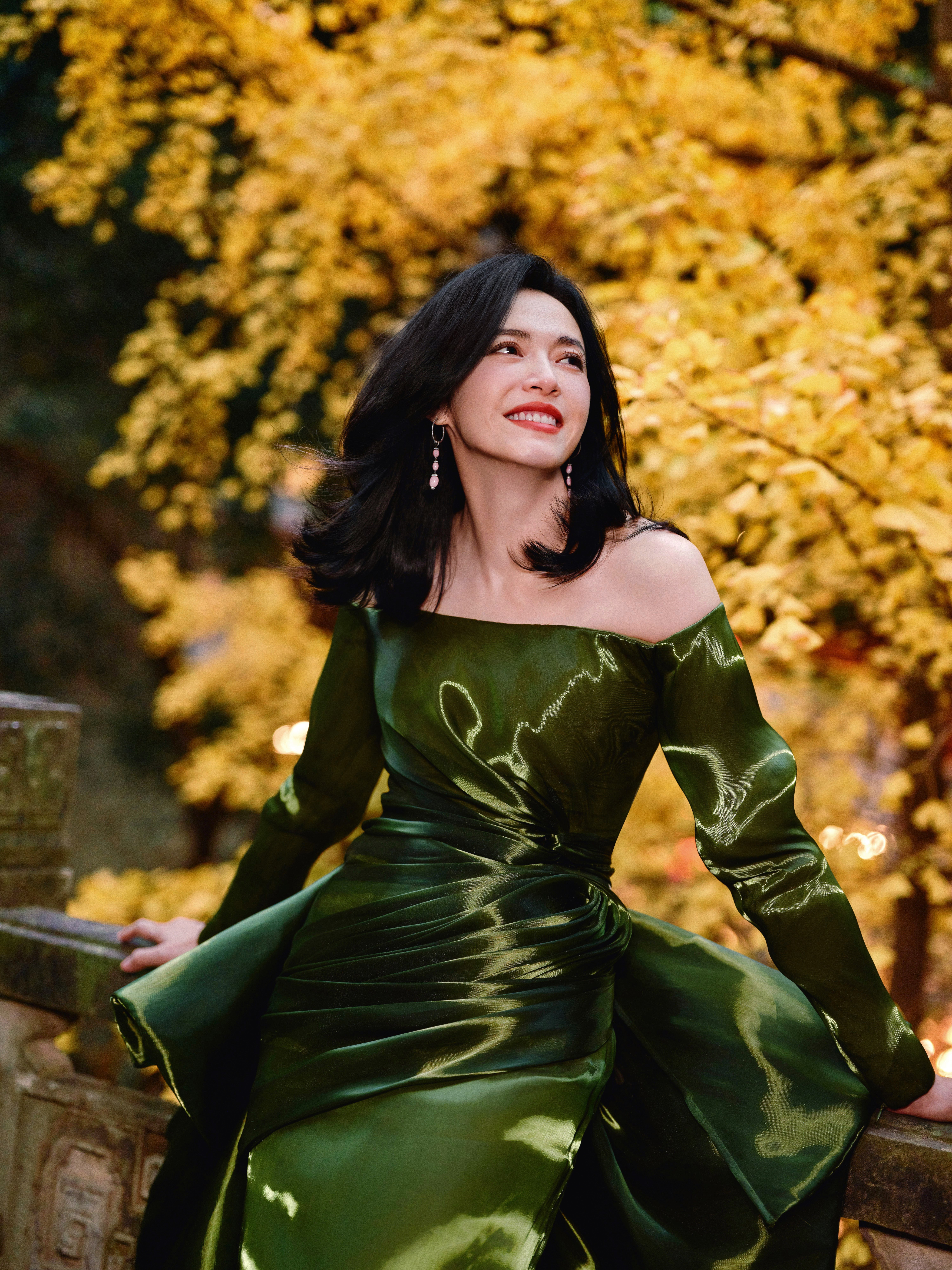 姚晨 × 中国电影120周年活力之夜 受邀亮相中国电影120周年活力之夜,一袭流光溢彩的缎面波纹绿色礼服裙搭配 Chopard 萧邦珠宝亮相,在深秋银杏的衬托下更显优雅、明媚与大气,完美适配大姚气质的一套Look,太美~👏📸🌿