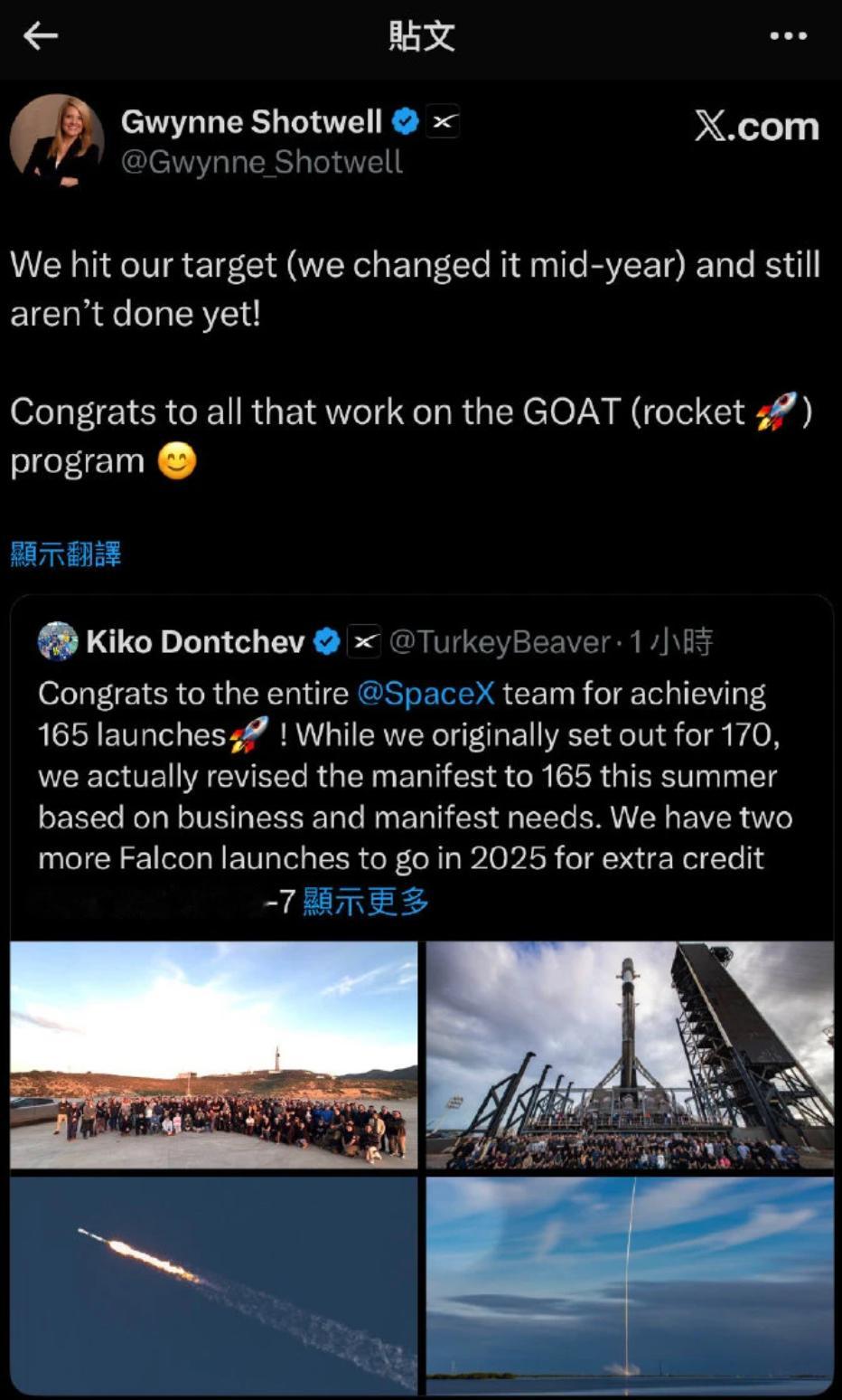 SpaceX 已提前完成年中设定的165次发射目标,预计年底还有两次发射。比2024年115次提升45%,比2023年96次提升70%以上,将再创新高。