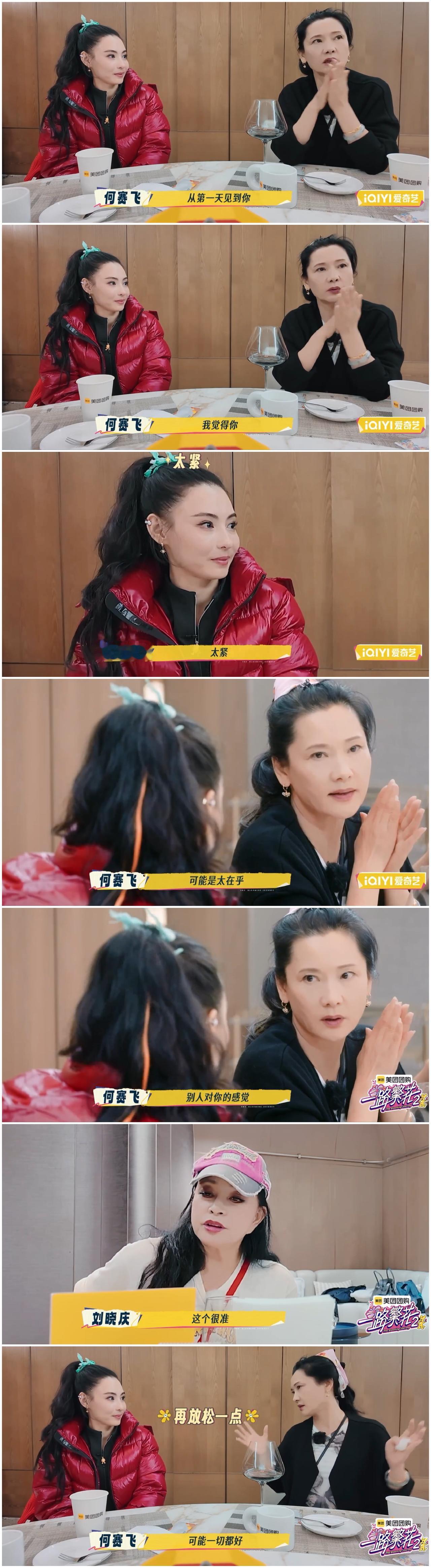 何赛飞坦言张柏芝太“装”, 刘晓庆强烈同意, 想必刘晓庆早就 想这样说了。 何赛飞评价所有姐姐的缺点, 觉得邵子恒没有放开,没有展示自己的专业技能, 柯淳跟粉丝交流太外放,不够收敛,要绅士与优雅, 宁静做直播和综艺太多,演戏艺术变少, 刘晓庆不服老,逞能, 刘嘉玲不生孩子不按传统标准生活。 而何赛飞说到张柏芝时, 她坦言张柏芝太紧绷, 太在乎别人对于她的感觉, 有点做“秀”, 不够真实与放开。 刘晓庆迫不及待表扬何赛飞 评价得很到位, 她也觉得张柏芝处处不放开, 看上去客客气气的, 但是说得不好听,就是“装”, 让人有距离感。 所以刘晓庆都不怎么敢 跟张柏芝沟通与交流。 于是出现了一名场面, 刘晓庆深刻评价了所有人, 唯独给张柏芝的评价就是“拍了很多电影”, 这下就尴尬了, 刘晓庆真的不了解张柏芝。 张柏芝在人与人之间建起了一堵高墙。 哎呀, 张柏芝曾强调被人背叛过, 所以不敢与人敞开心扉, 导致工作上都点头之交, 不敢深入交流。 也许她觉得不交出真心, 就不会受伤害吧。 其实张柏芝的一生也算跌宕起伏的, 眼看她要走上人生巅峰时, 老天又把她拉下低谷, 她可以支撑到当下的状态已经不错了, 但是心理不免留下创伤, 不敢轻易相信身边的人, 不敢轻易交出真心。