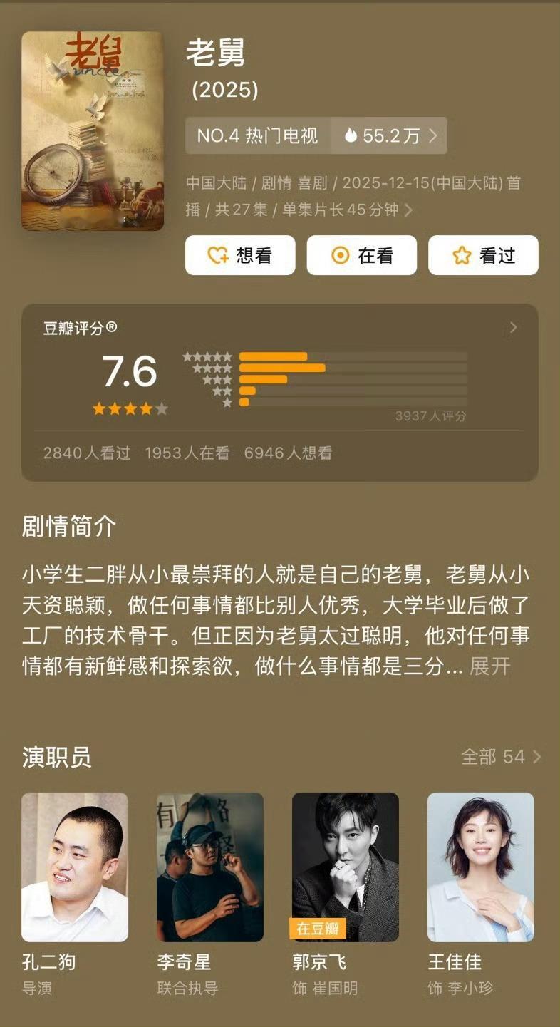 郭京飞老舅豆瓣开分7.6郭京飞《老舅》豆瓣开分7.6,开分好快,郭京飞演这种烟火气十足的角色还是手拿把掐的!老舅豆瓣开分7.6分