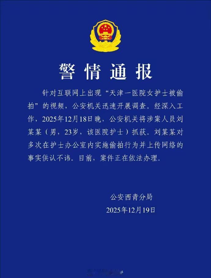 果然是“内鬼”干的!12月17日,有网友爆料天津西青区某医院护士更衣室遭偷拍,多名护士更衣视频流入不雅网站,视频中护士服清晰显示医院名称,摄像头疑似藏在桌面位置,时长近半小时,引发社会对医护人员隐私保护的关注。今天(12月19日),涉事天津建华医院所在地公安西青分局发布通报称,涉案人员刘某某(男,23岁,该医院护士)已被抓获,案件正在进一步调查中。 天津西青建华医院男护士偷拍女同事更衣并传播视频事件,随着涉事人员被抓获迎来阶段性结果。这场发生在救死扶伤之地的隐私侵犯,不仅是对受害者人格尊严的践踏,更撕开了职场隐私保护的薄弱防线,值得所有用人单位和从业者警醒。涉事男护士的行为早已突破法律与道德的双重底线。根据《治安管理处罚法》与《民法典》相关规定,偷拍、散布他人私密空间活动已构成违法,而2025年4月实施的《公共安全视频图像信息系统管理条例》更明确禁止在更衣室等隐私区域安装图像采集设备 。其多次偷拍并上传网络的行为,绝非一时冲动,而是对他人隐私权利的公然漠视,等待他的必然是法律的严惩。更令人不适的是,作为朝夕相处的同事、肩负护理职责的医护人员,本应恪守职业伦理与人际边界,而该男子却利用工作便利沦为窥伺者,更易给受害者造成持久的心理创伤。 事件背后,医疗机构的隐私保护漏洞同样不容忽视。护士更衣室作为员工专属私密空间,本应具备完善的安全防护措施,却让偷拍设备长期存在并成功传输视频,暴露出医院在物理空间管理、员工行为监管上的明显缺位。长期以来,医疗机构的隐私保护多聚焦于患者权益,却往往忽视了员工的隐私安全需求。事实上,从入职培训到日常管理,从空间设计到风险排查,用人单位都负有预防和制止隐私侵犯的法定义务,任何对侵权行为的纵容或管理失职,都可能让受害者陷入“维权难”的困境 。 “建华医院护士换衣遭偷拍事件”更应成为职场隐私保护的“清醒剂”。对个人而言,需明确隐私不受侵犯是法定权利,遭遇偷拍应第一时间固定证据、报警维权,既不纵容不法行为,也不因羞耻感让自身权益受损;对用人单位来说,必须摒弃“重业务轻权益”的思维,将员工隐私保护纳入常态化管理,不仅要完善更衣室、卫生间等私密区域的物理防护,更要通过制度规范、案例培训强化员工边界意识,建立“零容忍”的惩戒机制;对监管部门而言,需持续加大对偷拍设备销售、传播偷拍内容的打击力度,从源头遏制侵权行为的发生。此次事件提醒我们,隐私保护没有“真空地带”,职场安全更需制度护航。唯有法律严惩不手软、单位担责不含糊、个人警惕不松懈,才能让每个从业者在工作中获得应有的尊严与安全感,让职场真正成为相互尊重、彼此守护的空间。热点 天津西青建华医院护士遭偷拍内鬼被抓 警方通报“建华医院护士遭偷拍事件”