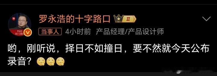 有种预感罗永浩公布录音迟早的事儿。 “择日不如撞日”并不是一时兴起,绝对是罗永浩的深思熟虑。 主动权在罗永浩这里,所以总会有人如芒在刺,有鲠在喉。 看来,有些梁子结下了,不是一时间就能过去的。