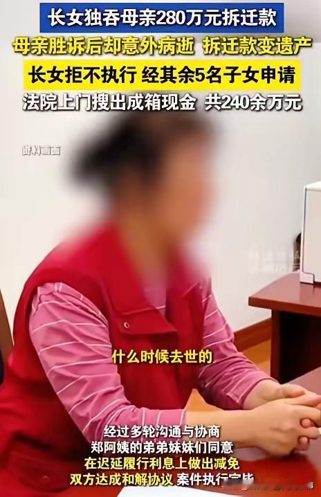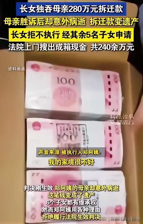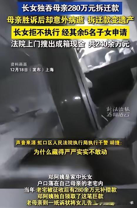 上海惊现“硬核不孝女”!独吞母亲280万拆迁款,躺百万现金上睡觉,2次拘留仍拒不交款,结局太解气! 上海一女子上演魔幻操作!母亲拆迁款280万全被她私吞,老母亲怒而起诉,胜诉后还没拿到钱便突然离世。 这笔钱瞬间成了遗产,6个兄弟姐妹人人有份,可她却铁了心拒不分割,甚至每天躺在100万现金上睡觉,嚣张至极! 法院两次对其拘留、查封房产,她依旧捂钱不撒手,以为能赖到底?最终结局让人直呼大快人心!上海母亲裸捐 不孝子女的后果 啃老儿女 不孝现象 素材来源于网络,侵权删除。