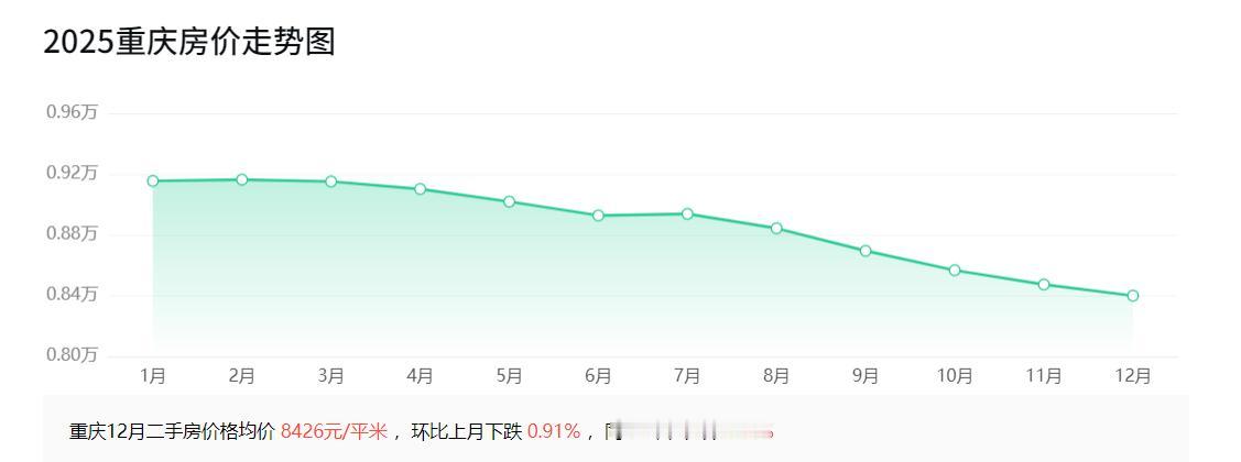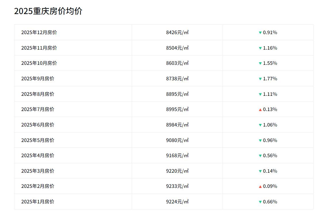 2015年11月,重庆房价均价6337元; 2016年11月,重庆房价均价7132元; 2017年11月,重庆房价均价9856元; 2018年11月,重庆房价均价12294元; 2019年11月,重庆房价均价11486元; 2020年11月,重庆房价均价11302元; 2021年11月,重庆房价均价12480元; 2022年11月,重庆房价均价11692元; 2023年11月,重庆房价均价10679元; 2024年11月,重庆房价均价9424元; 2025年11月,重庆房价均价8504元。   回顾重庆十年的房价,2025年11月的8504元相比2015年11月的6337元,增长了2167元,涨幅达34.20%。相比2025年1月的9224元,下降了720元,环比2025年10月的8603元,下降了99元。 2025年前三季度,重庆GDP达24449.36亿元,按不变价格计算,同比增长5.3%。其中,第一产业实现增加值1530.19亿元,同比增长3.5%;第二产业实现增加值8430.35亿元,同比增长3.9%;第三产业实现增加值14488.82亿元,同比增长6.3%。 截至2024年末,重庆常住人口3190.47万人,其中16-59岁劳动年龄人口为1924.17万人,占全市总人口比重为60.3%,规模优势及人口红利依然存在。 重庆房价2025年11月比2025年1月下降了720元,下降幅度不小,价格基本上回归到2016-2017年水平。不过也得看区域,核心区域的房价不降反增,远郊地区房价下跌明显,拉低了整体平均价格。  那么,在刚刚过去的11月份,大家对重庆的楼市有什么切身的体会,咱们在评论区聊一聊。  数据说明:以上均价数据,引用自安居客,仅作为分析参考,旨在反映重庆近十年的房价走势,不能准确映射当地实际房产价格。因为新房、二手房、不同区域不同位置的房价差别较大,占比也不同,仅通过一个均价不能一概而论。