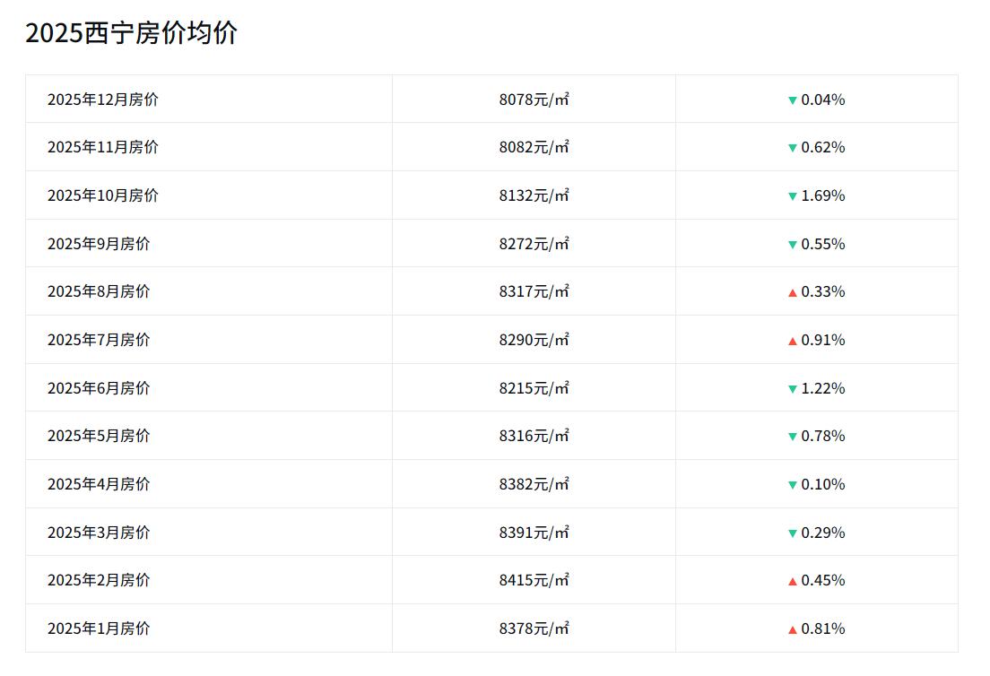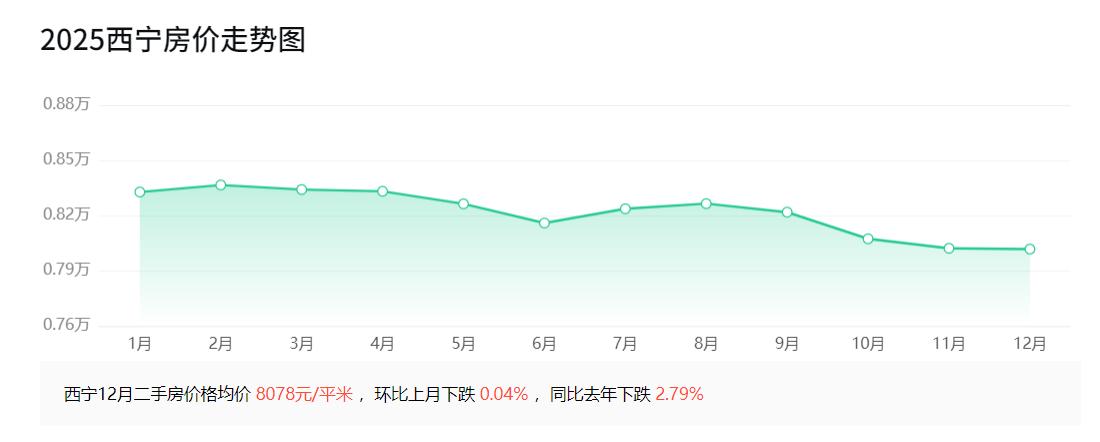 2015年11月,西宁房价均价6018元; 2016年11月,西宁房价均价6370元; 2017年11月,西宁房价均价6321元; 2018年11月,西宁房价均价7363元; 2019年11月,西宁房价均价9093元; 2020年11月,西宁房价均价9881元; 2021年11月,西宁房价均价10059元; 2022年11月,西宁房价均价9857元; 2023年11月,西宁房价均价9307元; 2024年11月,西宁房价均价8291元; 2025年11月,西宁房价均价8082元。 回顾西宁十年的房价,2025年11月的8082元相比2015年11月的6018元,增长了2064元,涨幅达34.30%。相比2025年1月的8378元,下降了296元,环比2025年10月的8132元,下降了50元。 2025年前三季度,西宁GDP达1386.3亿元,按可比价计算,同比增长2.7%。分产业看,第一产业增加值为48.3亿元,同比增长6.7%;第二产业增加值为451.6亿元,同比增长0.9%;第三产业增加值为886.4亿元,同比增长3.4%。 截至2024年末,西宁常住人口247.69万人,占全省常住人口的41.77%,其中城镇常住人口为200.11万人,比2023年末增加0.21万人,常住人口城镇化率为80.79%,比2023年末提高0.22个百分点。 西宁房价2025年11月比2025年1月下降了296元,下降幅度不大,价格基本上回归到2018年水平。不过也得看区域,核心区域的房价不降反增,远郊地区房价下跌明显,拉低了整体平均价格。 那么,在刚刚过去的11月份,大家对西宁的楼市有什么切身的体会,咱们在评论区聊一聊。 数据说明:以上均价数据,引用自安居客,仅作为分析参考,旨在反映西宁近十年的房价走势,不能准确映射当地实际房产价格。因为新房、二手房、不同区域不同位置的房价差别较大,占比也不同,仅通过一个均价不能一概而论。