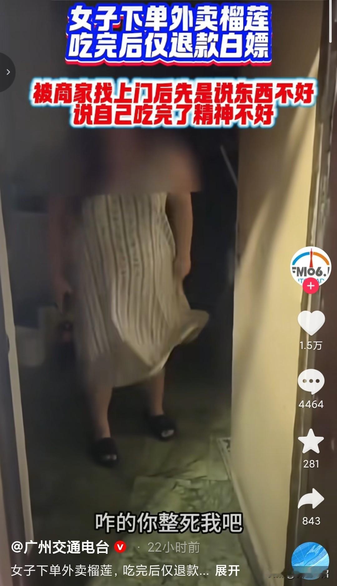 “仅退款”被商家带人堵到门口了,还这么嚣张,这些人确实应该好好整治一下了。 把榴莲吃完之后直接仅退款,商家找上门,她一出来就指着商家说:他们私闯民宅,让他们不要再拍了,已经侵犯她肖像权了,守法意识淡薄,维权意意识极强。 她还打电话给美团客服说店家上门骚扰她,说他家的榴莲烂了,坏了,自己吃了精神不好,反正就是不把钱还给商家。 心态已经摆烂了,说:你爱发抖音就发抖音,名声什么的已经无所谓了。 在这个事件里面钱都是小问题,关键她把所有的错全推给商家,平台也纵容她,拿她真的一点办法都没有。