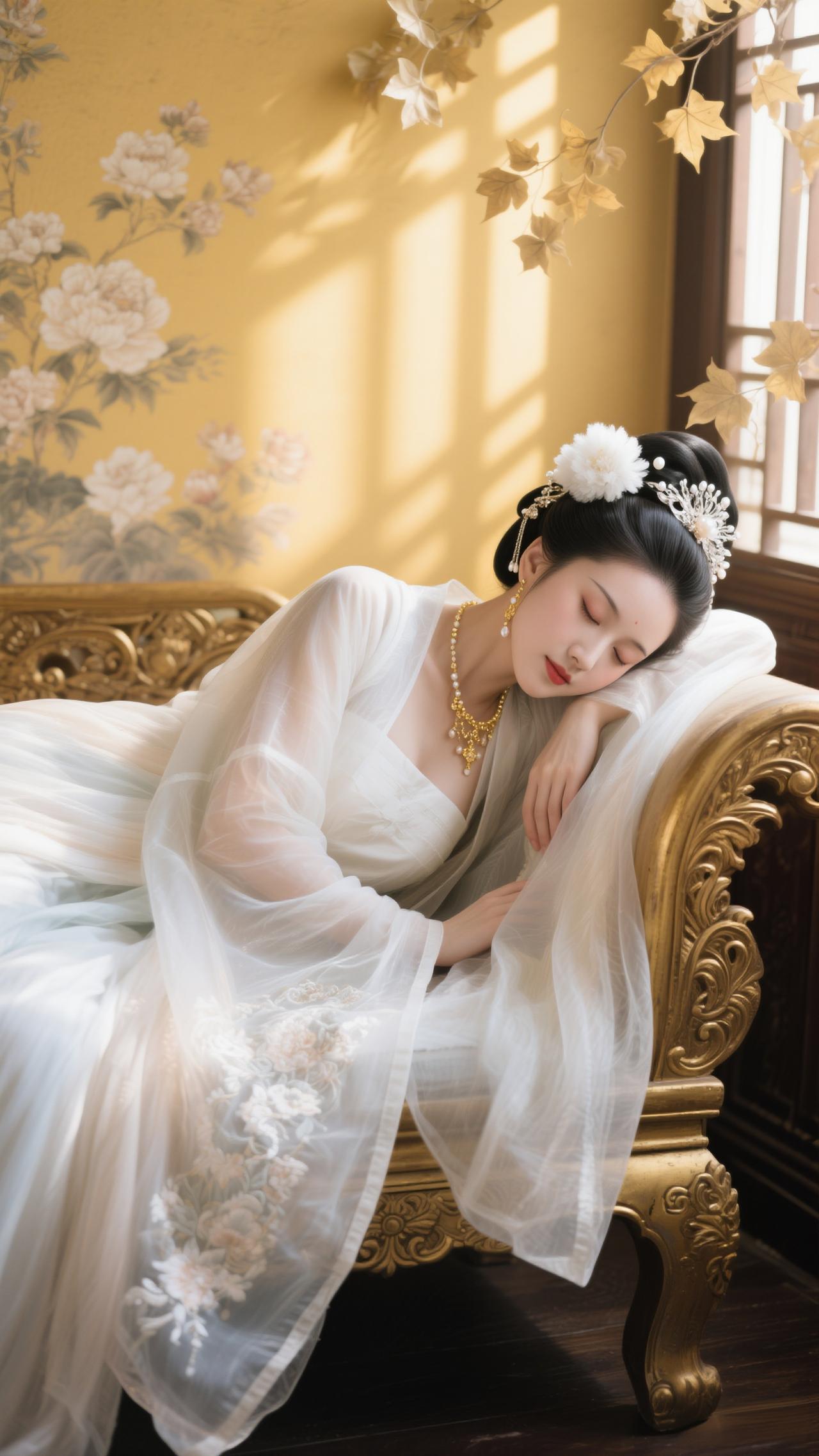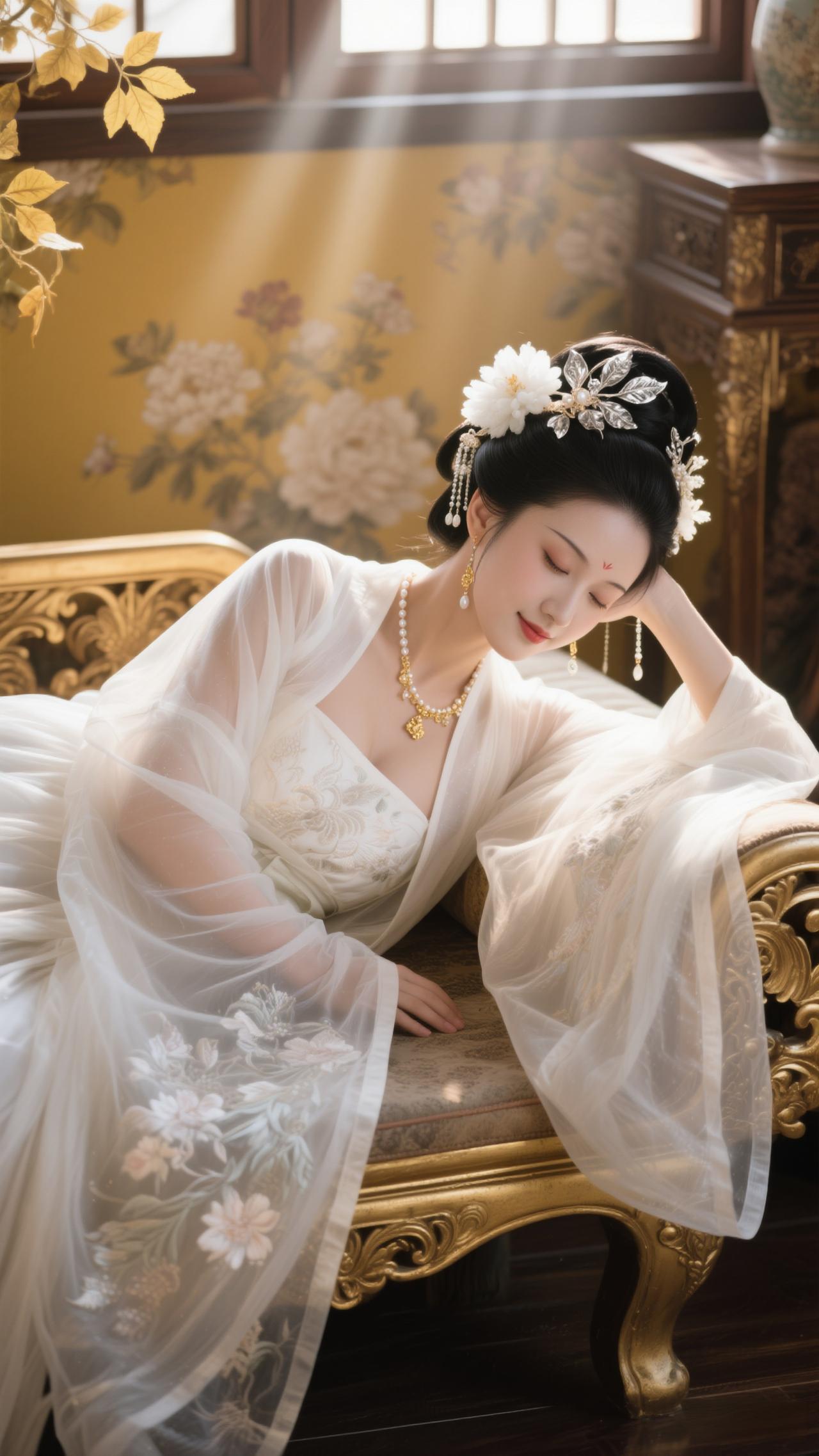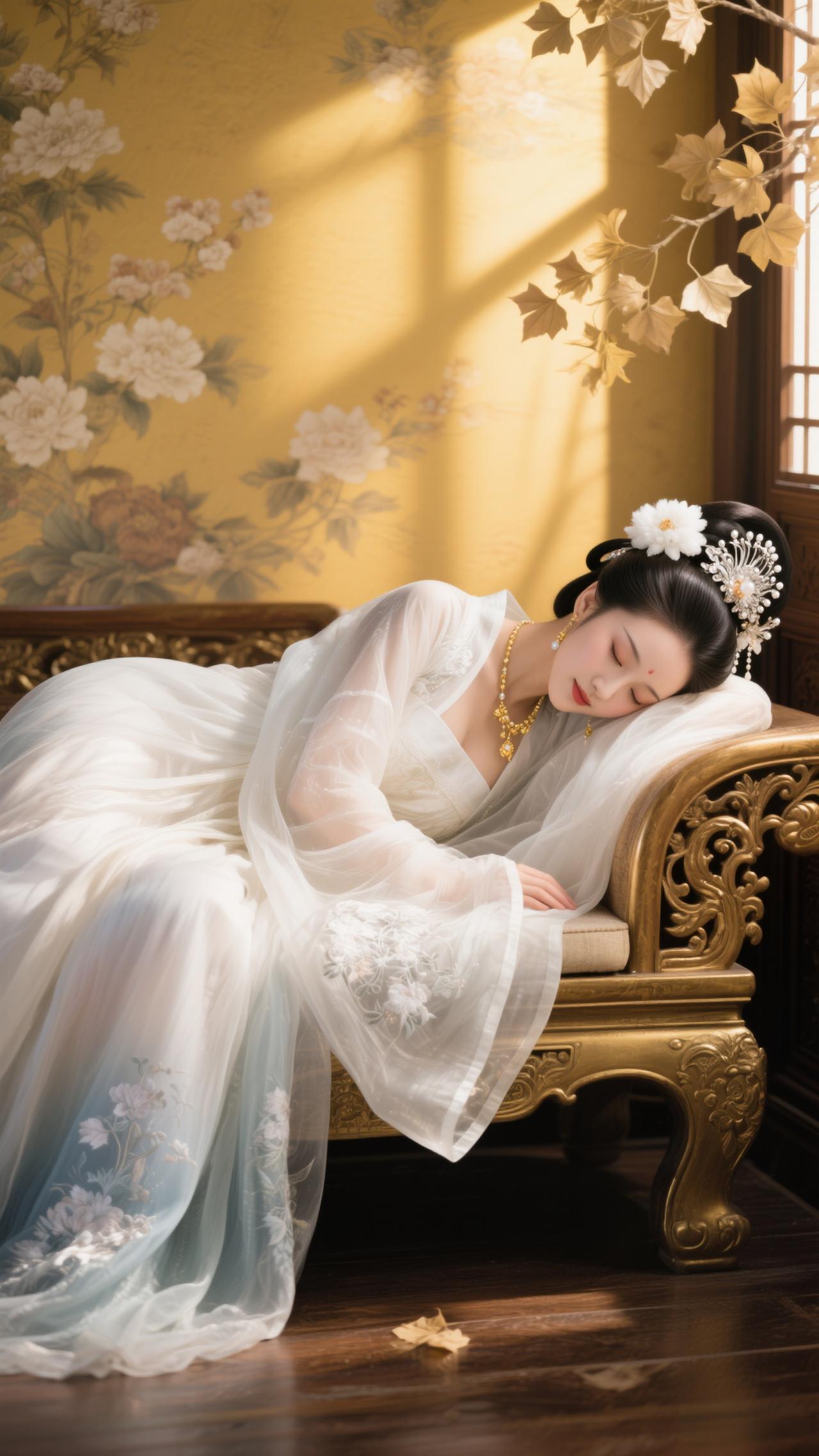 《醉花阴·金榻慵眠》 白縠轻笼金榻静,鬓畔花凝影。 暖日透窗纱,一叶秋光,偷落青丝顶。 半醒半醉慵梳鬓,笑把流光省。 不解梦魂遥,一晌春闲,都付风前影。